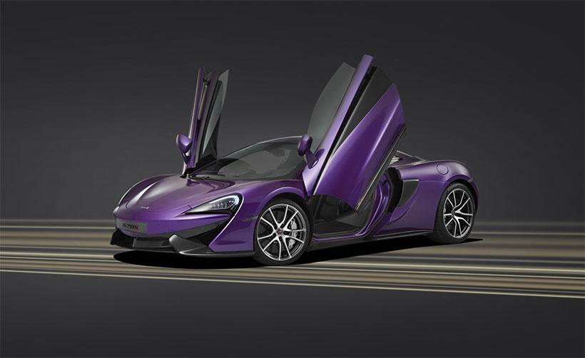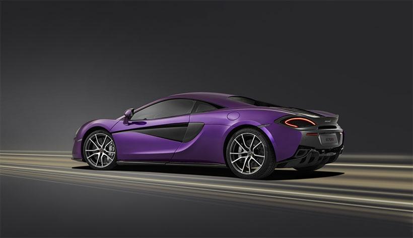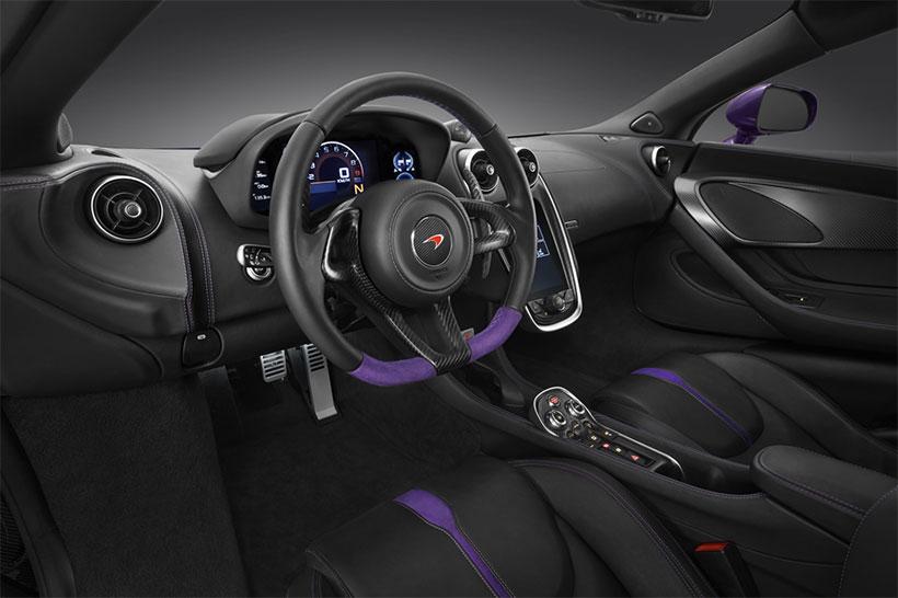 The first of the customized 570S Coupes will be the Mauvine Blue car that you see here, which is purple. The paint color on the outside of the car is completely customized and the interior has custom black carbon leather and Mauvine Blue trim to match the outside of the car.