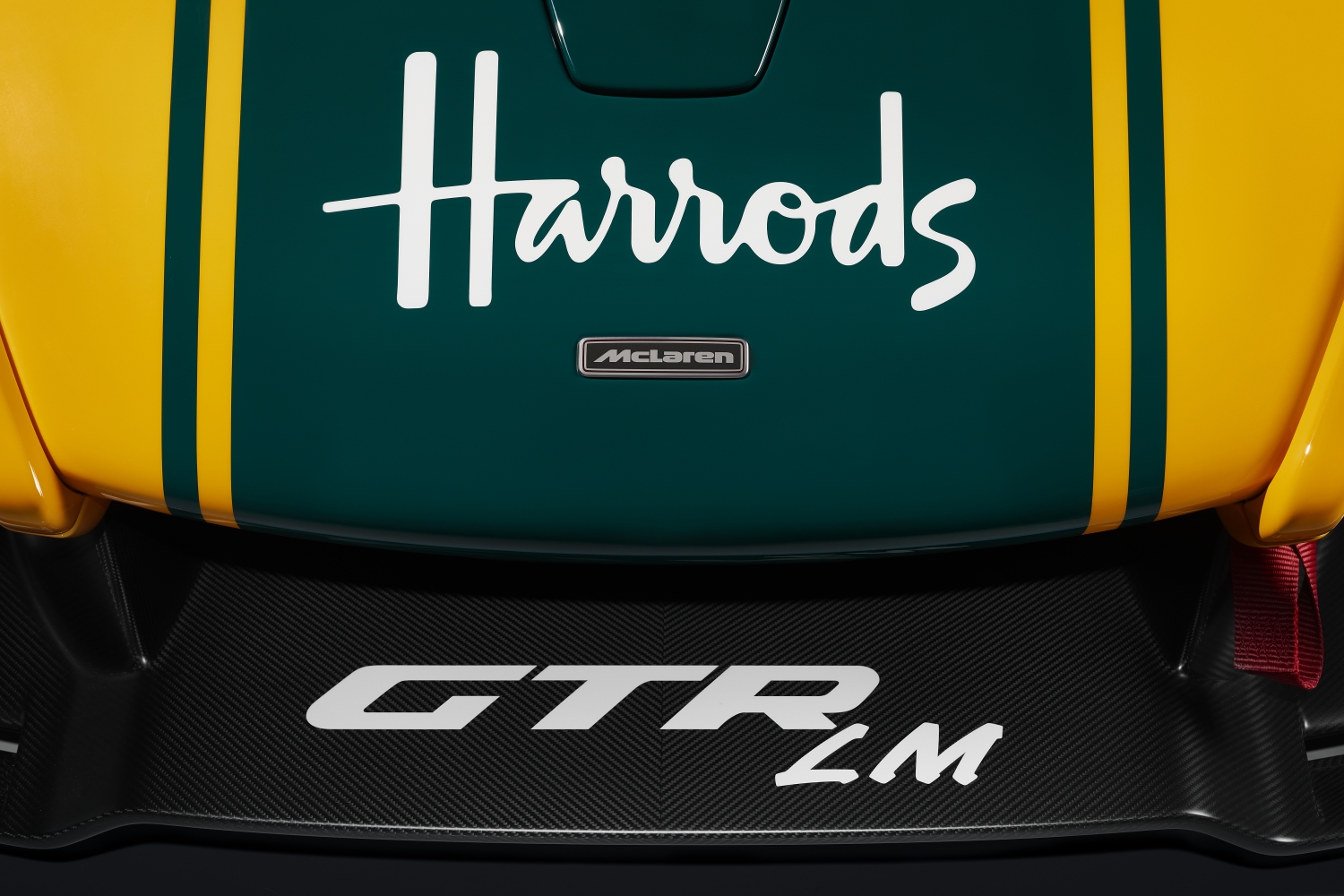This particular McLaren Senna GTR LM has a Solar Yellow paint job, Heritage Green racing stripes, and Harrods branding – the first time that the Harrods logo is seen on a McLaren in the past 25 years.