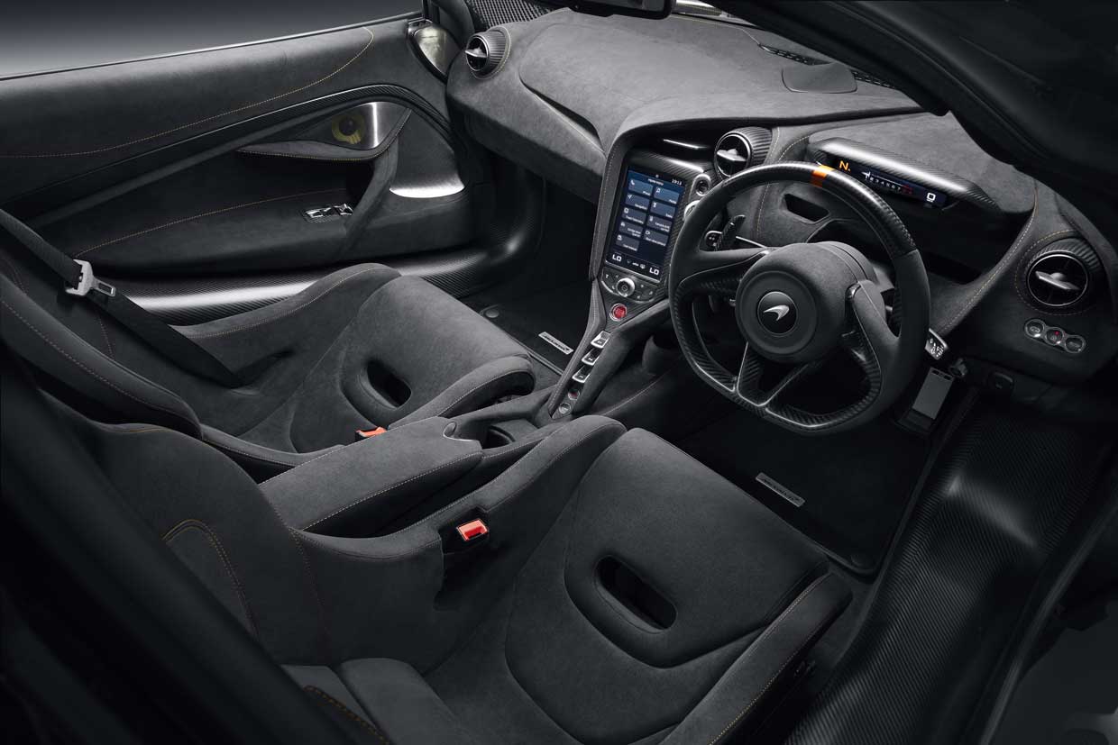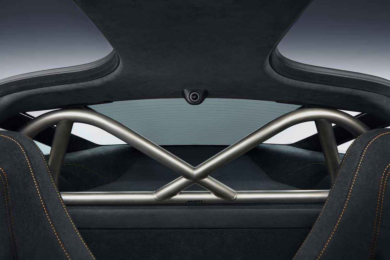 The interior and exterior carbon fiber on this car are satin finished. Inside the car has back Alcantara with McLaren Orange contrast stitching. The harness bar behind the seats is made from titanium and is about 50% lighter than a steel version. It can be fitted with a 6-point harness for track use.