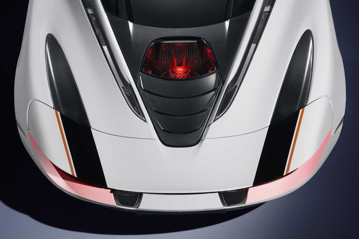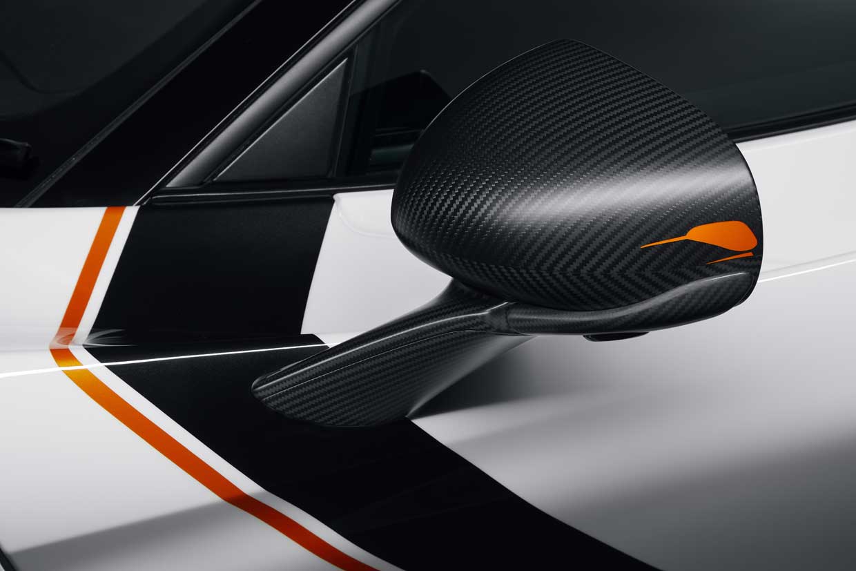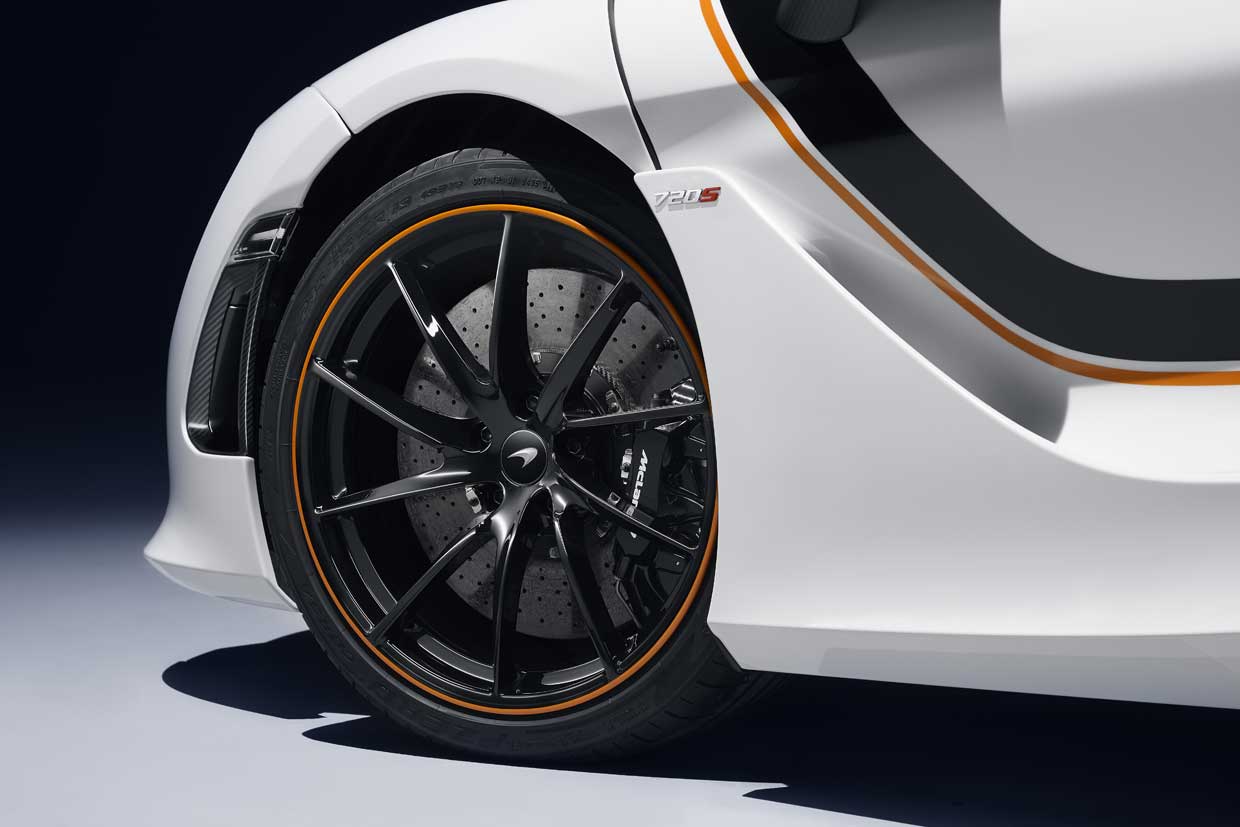 The Track Theme car is painted Anniversary White and was influenced by the McLaren F1 car. The Pacific Theme is said to draw from the sophisticated technical luxury of the 720S. The Track Theme was commissioned by McLaren Manchester and the paint color is a bespoke MSO option. Detailing on the bonnet, doors, rear quarter panels, and airbrake are hand painted in Carbon Black. The Tarroco Orange touches are a color from the F1 2017 racing car McLaren fielded.