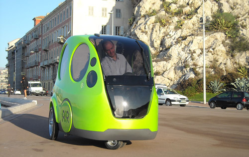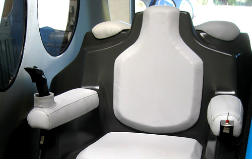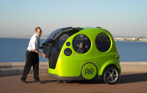 Air compressed to 2,900psi sits in carbon-fiber tanks behind and underneath the driver, while steering is managed by a joystick and acceleration/braking by regular pedals. While the bubble-car design might suggest it can only accommodate one, in fact there's a rear-facing bench in the back that's enough for up to three to catch a ride. Maximum speed for the prototype is 30mph, but the commercial model – expected to go into production by the end of 2009 – will reach 50mph.