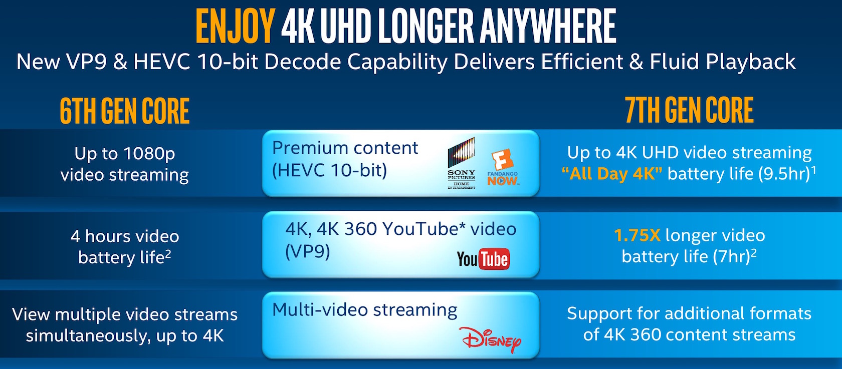It's partly down to the new media engine, which Intel built on the Gen9 graphics architecture. There's a dedicated media engine for video decoding, designed both for power efficiency and supporting parallel engines for greater performance throughput. Everyday users should see the impact in 10-bit HEVC and VP9 video, not to mention power consumption during playback; indeed, Intel predicts around 75-percent better battery life when playing VP9 footage compared to the old chips.
