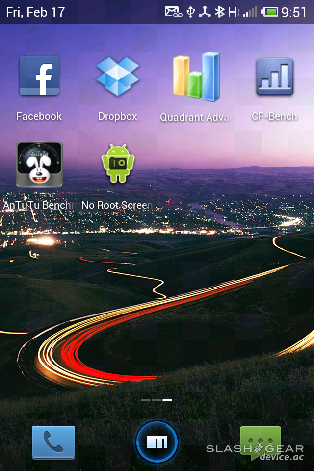 The lights on either side of the Home button are capacitive and can represent a number of different functions. When you see three lights in a row, you know that it's a menu button. When you see three lights in a triangle, you know that it's a back button. When you see one light, you know that your device is awake, but that the button will not do anything except give you haptic feedback. When the phone is asleep, these light-up buttons serve as notification lights, "breathing" in and out whenever you get a notification – be it for a message, an email, or whatever else you've got hooked up to give you notifications all the live long day.