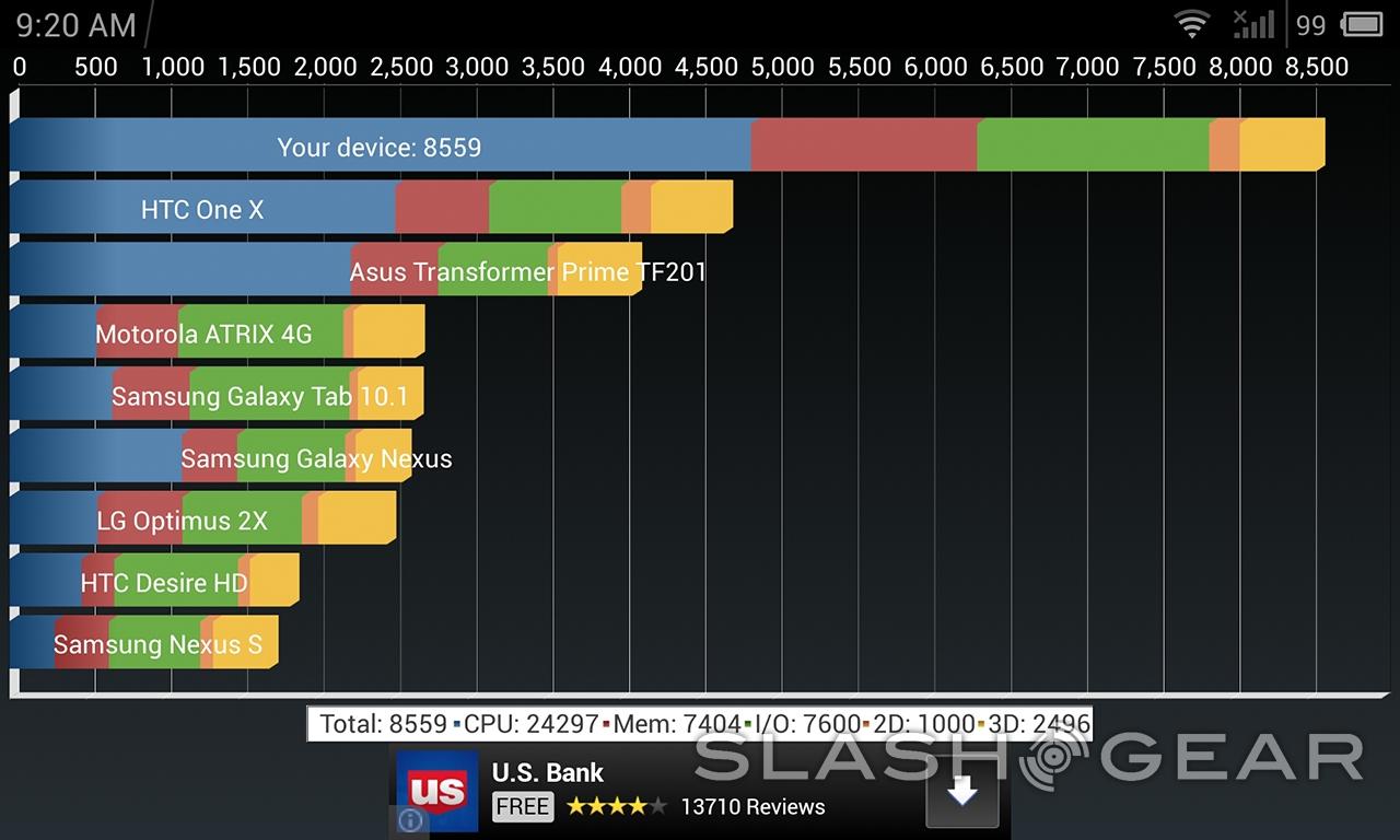 Under the hood you've got an 8-CPU-core Samsung-made Exynos 5 processor – coming with 4x A15 cores clocked at 1.6GHz as well as 4x A7 cores clocked at 1.2GHz. This is all manufactured with 28nm architecture – and if you're wondering what you're going to do with all of these cores, we're right along with you.