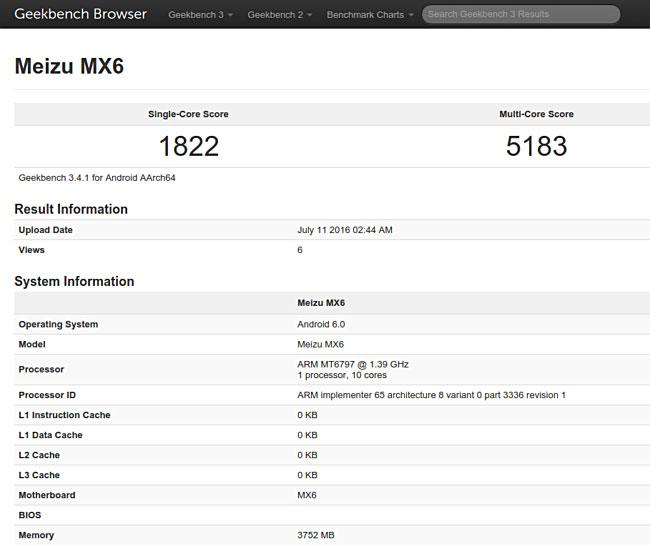 The Meizu MX6 smartphone isn't set to get an official announcement until July 19. Ahead of that official announcement, someone who has their hands on the device already just couldn't resist a run through Geekbench to taut those looking forward to the device with its deca-core processor. Specs grabbed by Geekbench show that the ARM MT6796 Helio X20 processor runs at 1.39GHz with all ten cores.