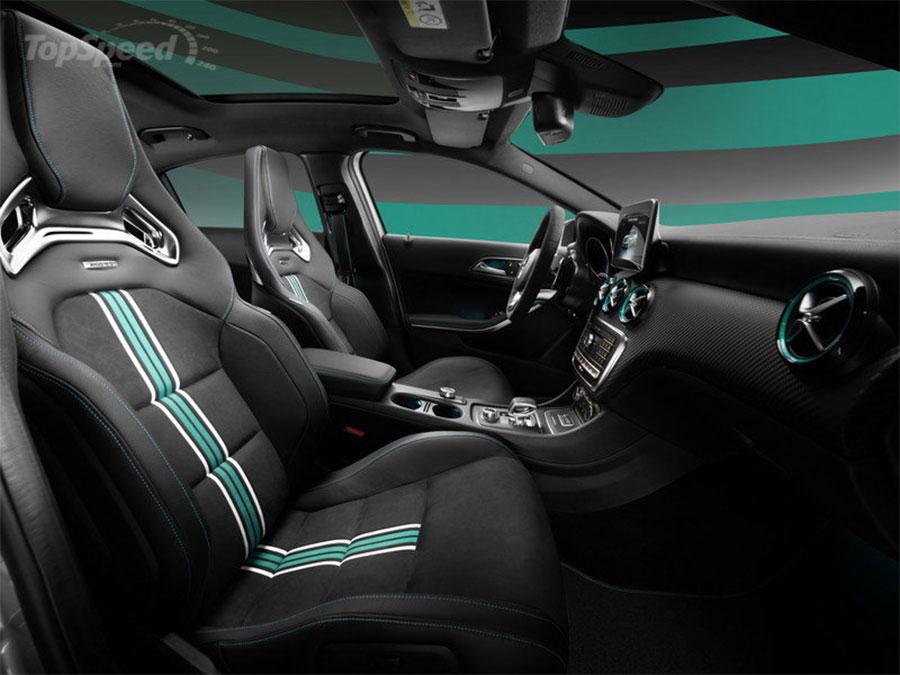 The car is offered in three colors including Mountain Grey Metallic, Deisgno Mountain Grey Magno, and Polar Silver Metallic and each of the colors come with the Petrol Green and black livery that is meant to look like the livery used on the Mercedes AMG F1 car. A45 Champions Edition cars also get an aero-kit on the body with bumper canards, larger front splitter, and a big roof spoiler.