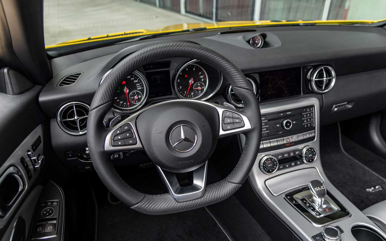 The car comes with standard 5-spoke AMG light-alloy wheels in 18-inch diameter with a high-gloss black finish. For improved handling and style Mercedes lowers the suspension by 10mm compared to standard SLC 300s and the car gets larger brakes. Inside the car has two-tone Nappa leather in black/silver pearl with grey topstitching.