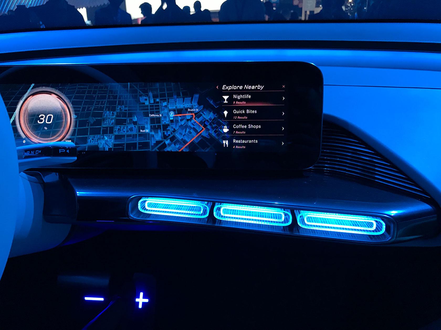 Touch controls appear on the steering wheel for climate control and music and infotainment system control. A touch interface on the center console allows access to infotainment – music, most importantly – for both the driver and the passenger. A large dash touch interface appears to float ahead of the steering wheel, complete with glowing blue edges of a turn-by-turn experience that we swear we've seen somewhere before.