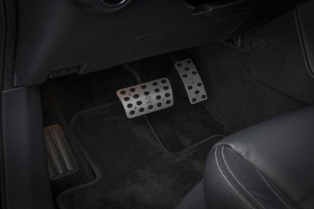 The wheels are changed from the stockers to 20-inch split spoke units that look cool. The Mercedes emblem on the grille is swapped out with a massive "B" for Brabus. A different front license plate carrier and quad tailpipes are added.