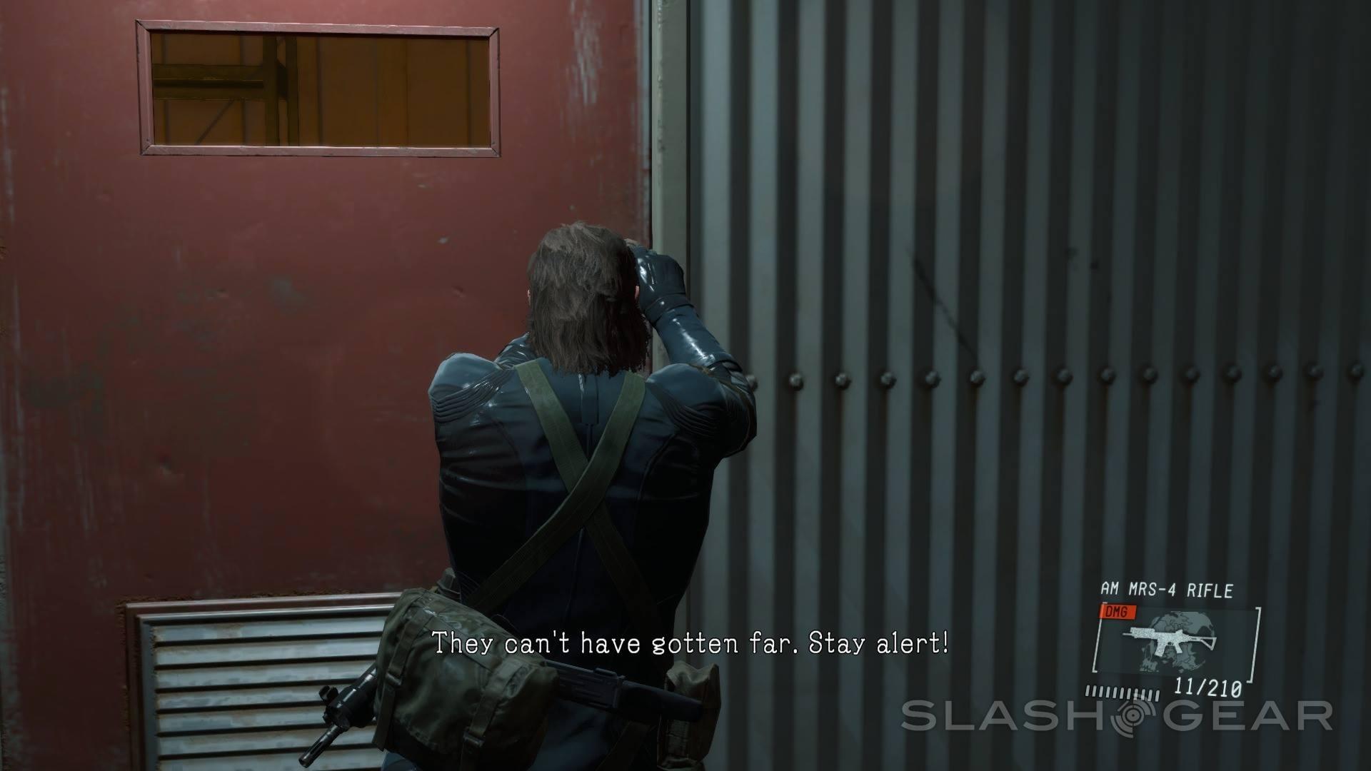 There's a sense in the main mission that your enemies will be far more interconnected in Phantom Pain than they've ever been before. You can hear radio calls between troops throughout the base you're exploring here, and should you alert one guard, you've got a short amount of time to hide or execute him before he's got the whole squad gunning you down.