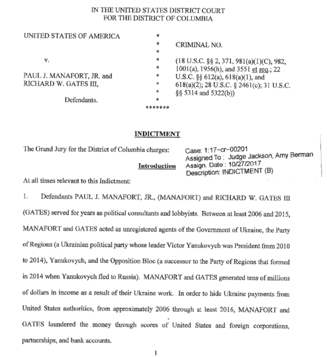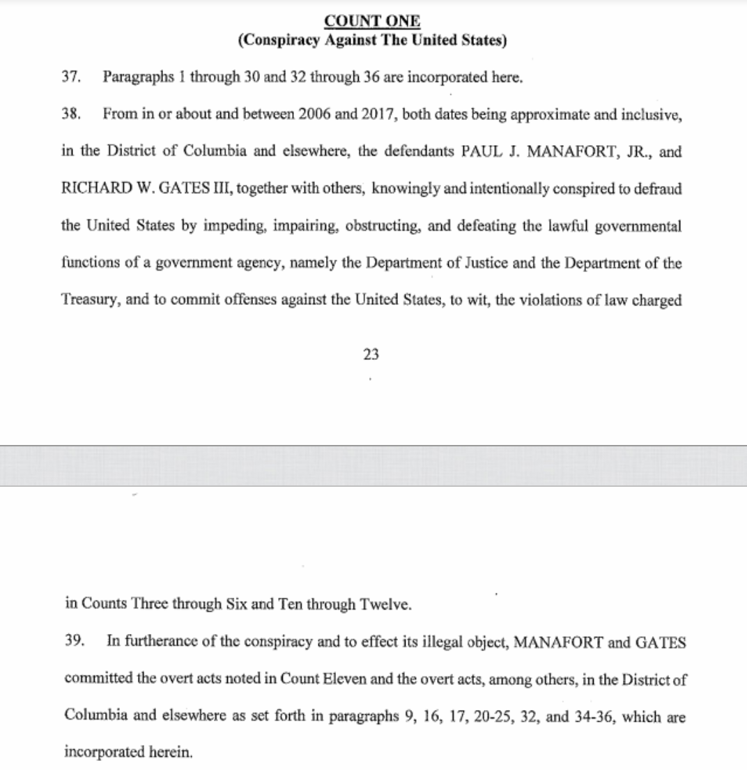 Next we've got a few documents from the case as it stands today. These papers, in a gallery below, in screenshots, came from the New York Times. Perhaps the most important point in this document is that COUNT ONE is "Conspiracy Against The United States". This is a major offense.
