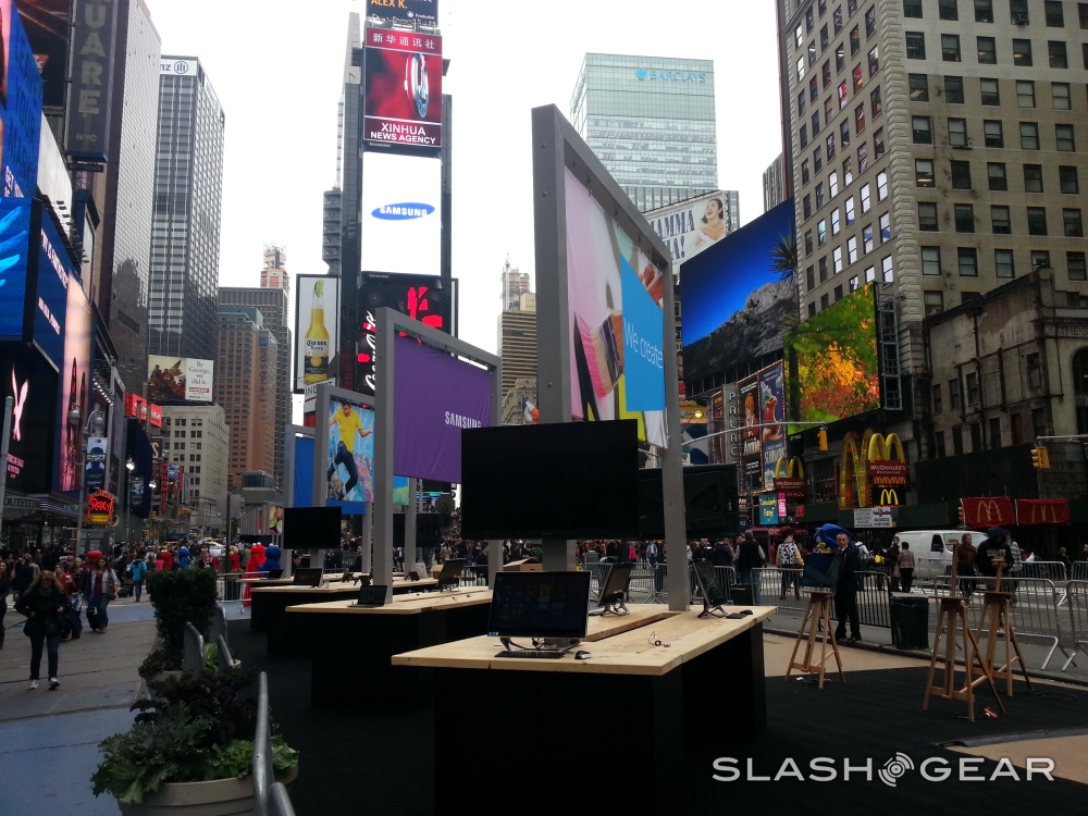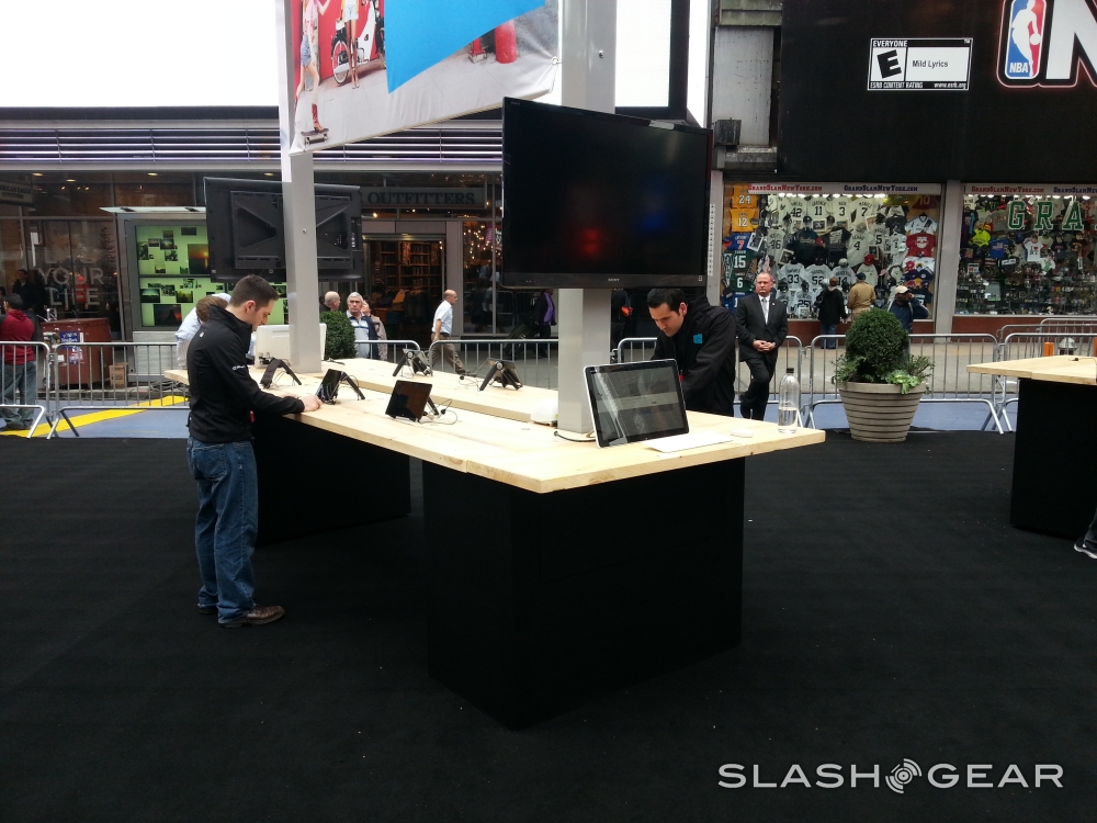 In addition to the massive takeover of a fabulous 39 digital boards with one massive Windows 8 Start Screen later tonight, Microsoft has made it's play for the very center of Times Square with a hands-on experience for the public. Each of Microsoft's major manufacturing partners was invited to bring their own wares to what's essentially the most highly-visible showroom floor in the world, with anyone and everyone invited in to take a peek at the wares starting here at the launch of Windows 8. This presentation adds to the already unique display the company (and companies, as it were) has made for the press and the public in an effort to create a winning atmosphere for the birth of the newly released operating system.
