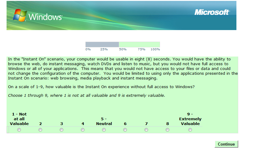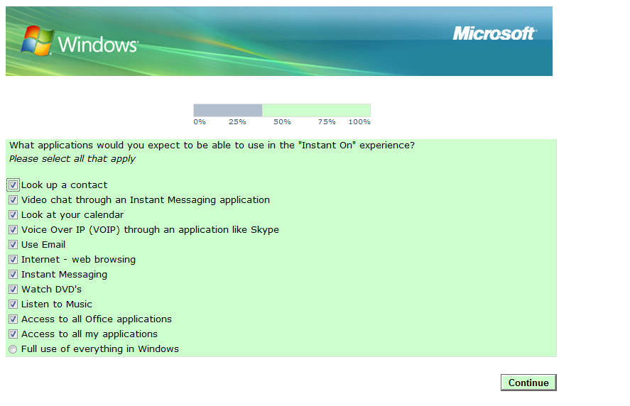 However users would not have access to the full range of Windows options and applications, for instance files and data. Part of the survey asks would-be users to judge how useful they would consider solely having use of web browsing media playback and instant messaging.