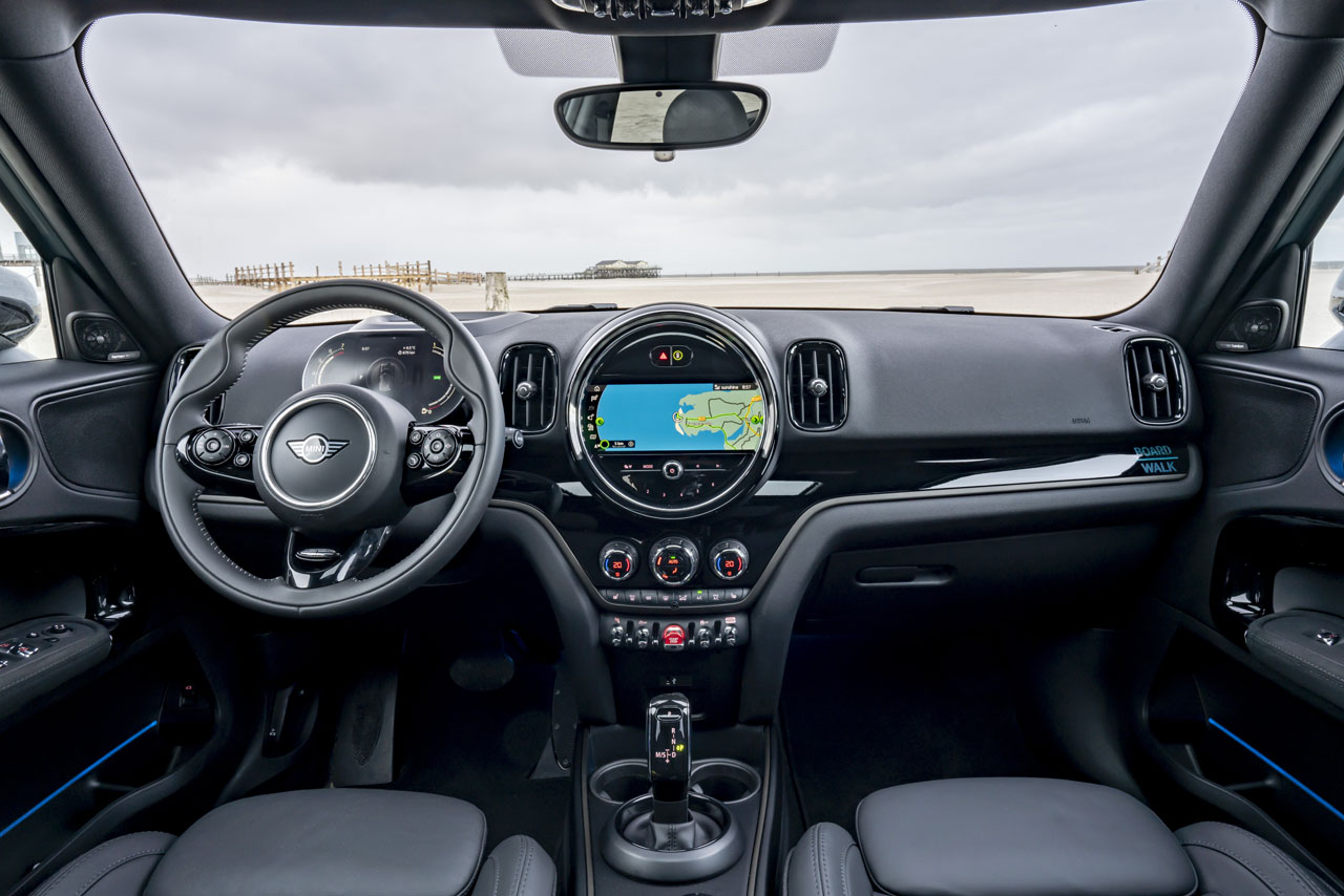 The sides of the roof at the rear windows and the interior bar on the passenger side also bear the logo with the model's name. Three versions available include the Cooper Countryman Boardwalk with a three-cylinder gas engine using turbochargers to produce 136 horsepower. A four-cylinder engine is available with 178 horsepower in that model.