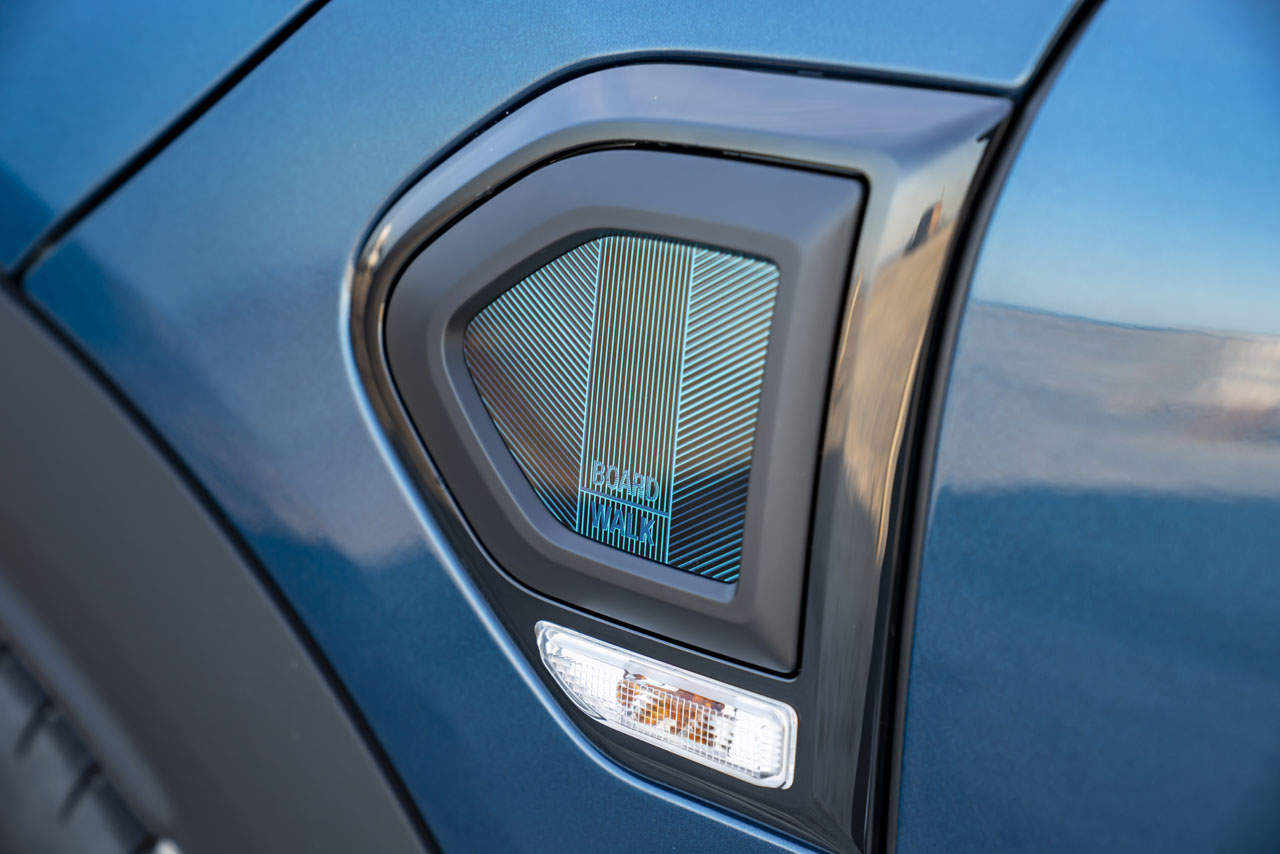 Deep Laguna metallic is a blue tone color previously developed as exclusive for the MINI Convertible Sidewalk edition. The black finish on the roof and exterior mirror caps contrasts the blue color of the body. The emblem on the car was inspired by the boardwalks found on British beaches, as were the Side Scuttles.