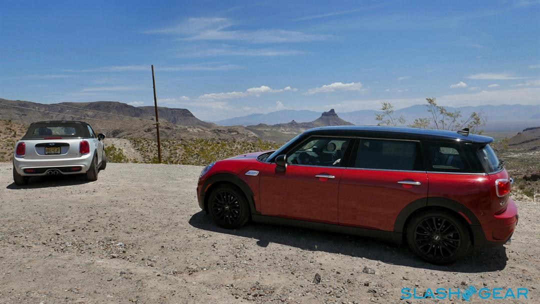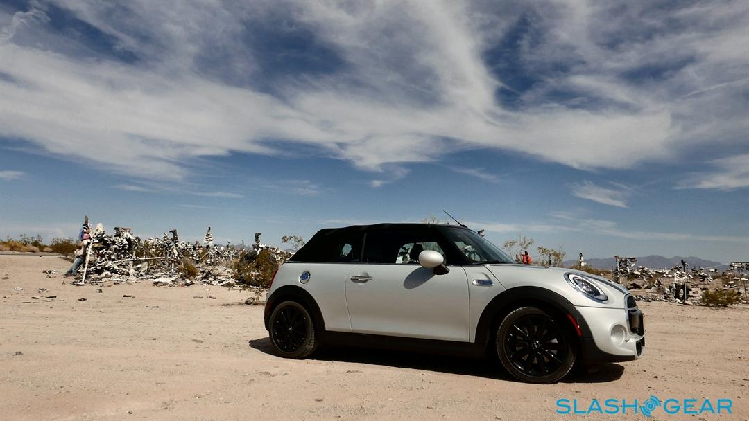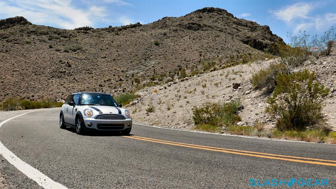 Weiner is a pro, hovering the John Cooper Works drop-top just a few feet behind the 18-wheeled hauler in front of us, an older hyper-miler's trick to take advantage of about as much aerodynamic draft as you'd find on the inside row at Daytona. Our low-tech range-extending plan sounds stupid, but it works: once we crest the hill that had been sapping miles from the tank, the Mini's trip computer begins a slow, but steady climb back towards a less frightening, not quite as sunburned depiction of our final moments on earth. The Chevron sign looms in the distance, and by the time we roll up to the fuel pump we've built a 28-mile cushion between laughter and disaster. We're not the only ones taking advantage of this rare oasis of gasoline and Slim Jims, as almost every parking spot and fuel pump features a Mini of its own, dusty from the Mohave's heat.