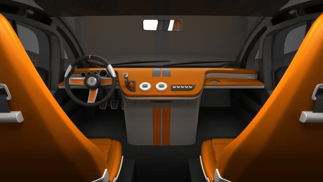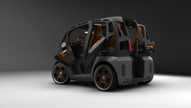 The company aims to be environmentally-friendly by using recycled polymers for more than half of the car's body. The car's only proper door would be located in the rear where the truck would ordinarily be, though each seat has an opening panel that appears to be a half-door. Because of its size, the car could be parked perpendicular to the curb, making the rear door practical (if you back in toward the sidewalk).