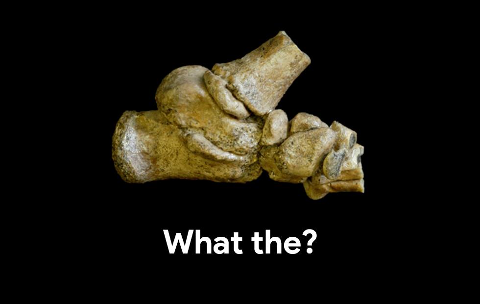An ancient human ancestor dubbed Selam was written about in a paper published this week in Science Advances. This very young Australopithecus afarensis's foot is the oldest hominin foot ever found with all of its tarsals preserved – those are effectively the bones in a foot that do not include the toes – basically the ankle. This tiny humanoid had a foot with a toe that allowed it to grip, in a position similar to that of the blade claw on the foot of Jurassic Park's velociraptor.* UPDATE: Not exactly, but sort of.
