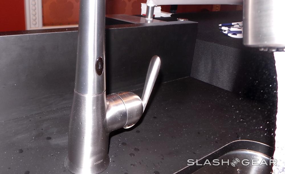 This week we got the opportunity to take a peek at the newest Moen water distribution system for your sink, the MotionSense Touch-Free faucet. Moen's own Maribeth Kwasniewski showed this system off with us at ShowStoppers during CES 2013, revealing the multiple ways you're able to activate it when you get it for yourself in the very near future. The first of these is the Wave Sensor – that black dot at the top of the neck of the faucet, able to toggle the water's flow when you move your hand over or across it.