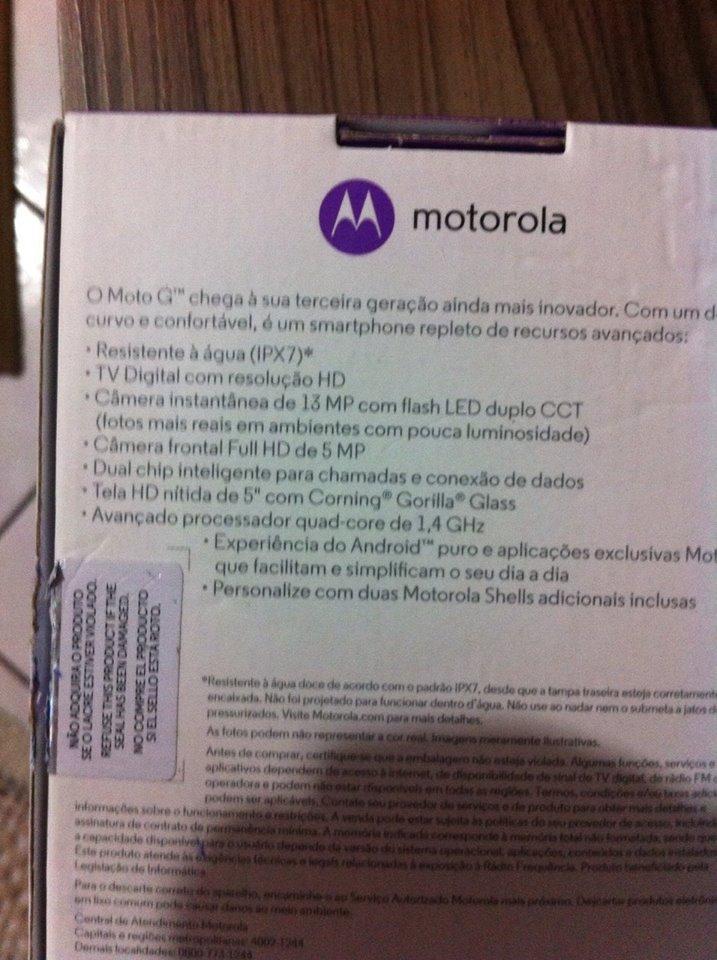 The packaging reveals some of what we've already heard in past leaks: 4G connectivity, a 5-megapixel front camera and 13 megapixel rear camera, and 16GB of storage, to start with. The sticker on the front of the alleged Moto G 3rd gen revealed an IPX7 waterproof rating, dual micro SIM slots, some sort of HD TV feature.