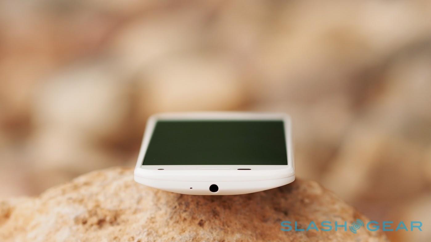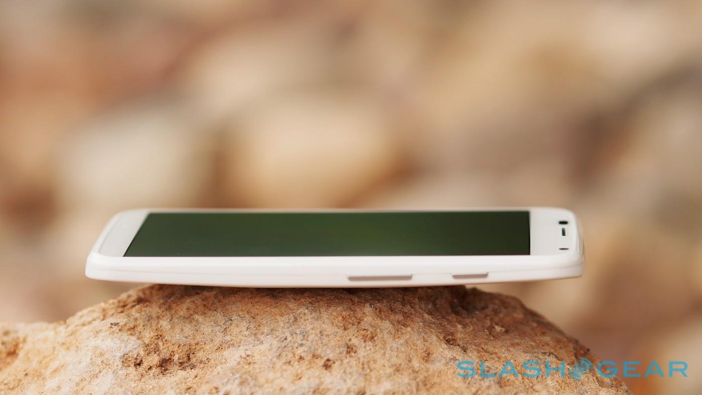 The back has a reasonably pronounced curve across it, filling your palm neatly, and is finished with a crosshatched texture that makes gripping it easy. Branding is mercifully limited to a small, round Motorola "M" in the middle and the carrier logo at the bottom; the front is completely logo-free. At 65.3 x 129.3 x 5.6-10.4 mm and 130 grams it's a surprisingly compact device, even though it shares the same 4.7-inch screen size as the HTC One – the minimal top and bottom bezels help, here – and while it's not exactly the most premium-feeling phone we've touched, it's solid and reassuringly sturdy.