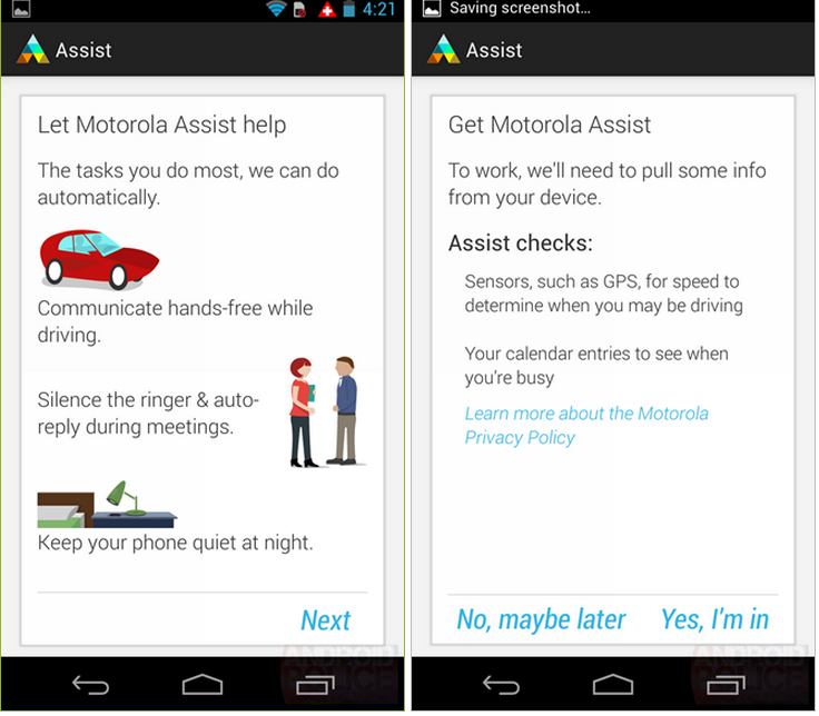 First up is Motorola Assist, which you can see the screenshots for in the image above. This will reportedly be the alternative to the Smart Actions with the DROID handsets, and will serve functions like automatically putting the Moto X into hands-free mode when the user is driving, and silencing the handset during a meeting.