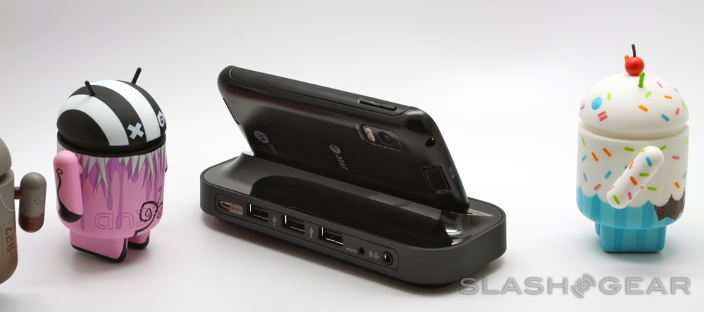 Motorola's desktop dock is a halfway house of sorts between the Laptop Dock and the basic HDMI connection the ATRIX 4G itself offers, including not only an HDMI output but three USB ports for hooking up peripherals and a 3.5mm stereo audio output. They could include a wired keyboard and mouse, though Motorola also sent us its Bluetooth keyboard/mouse set.