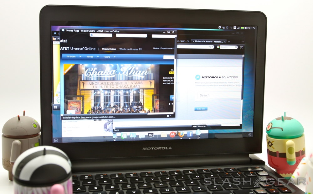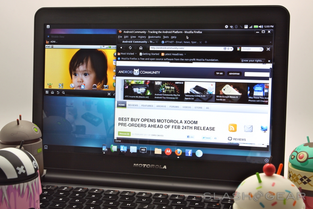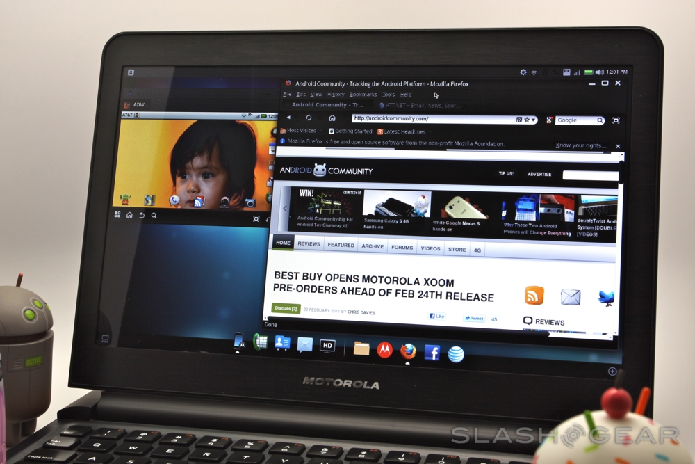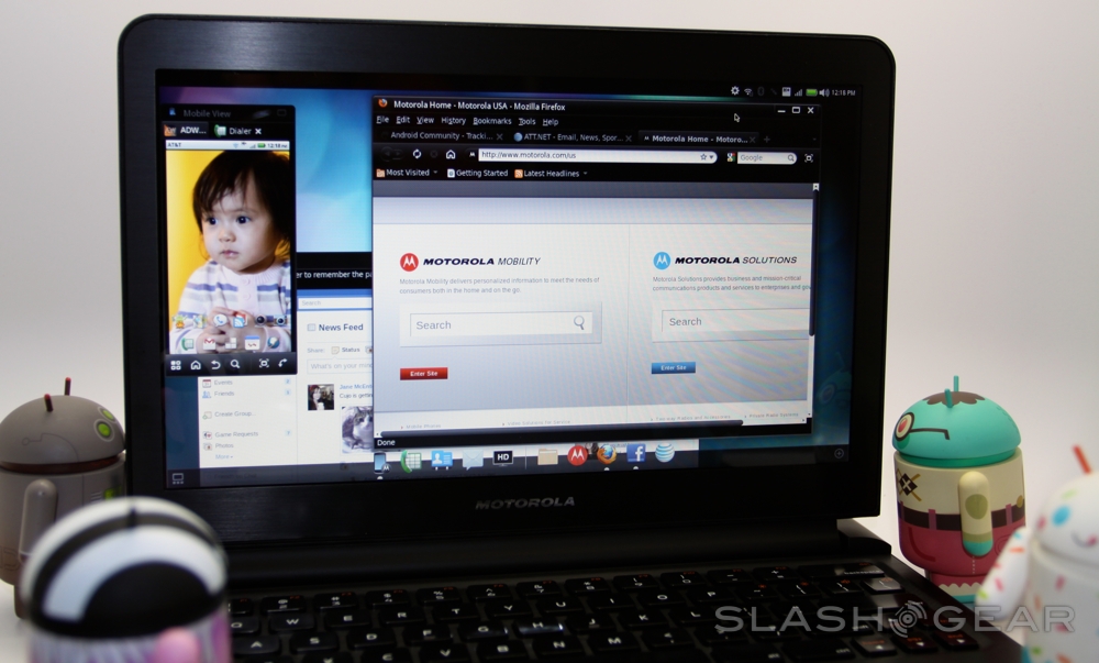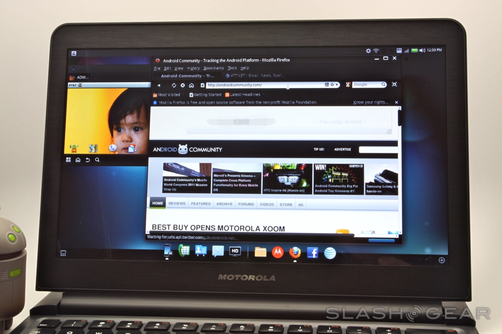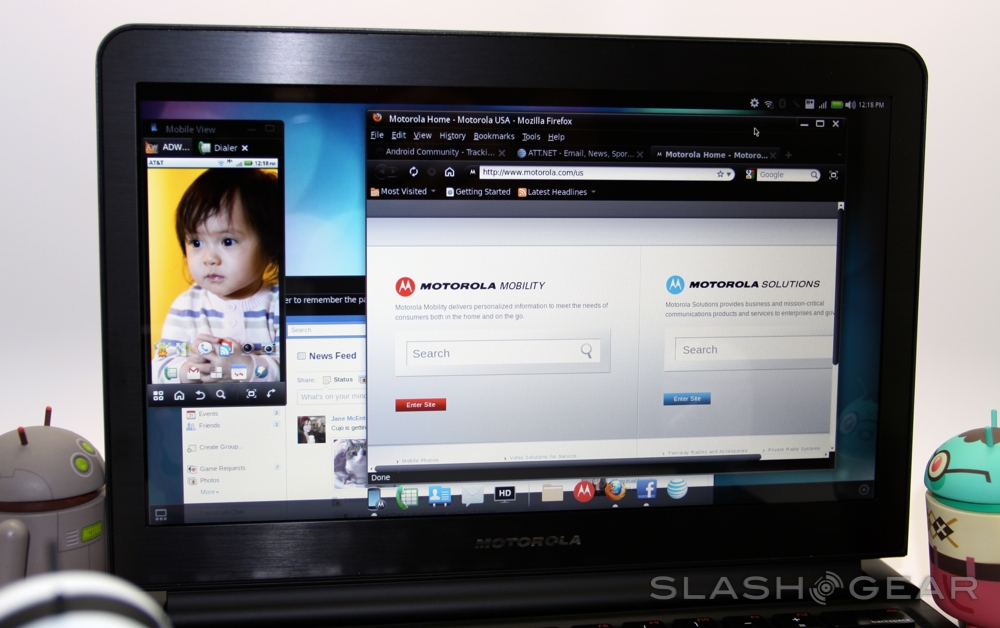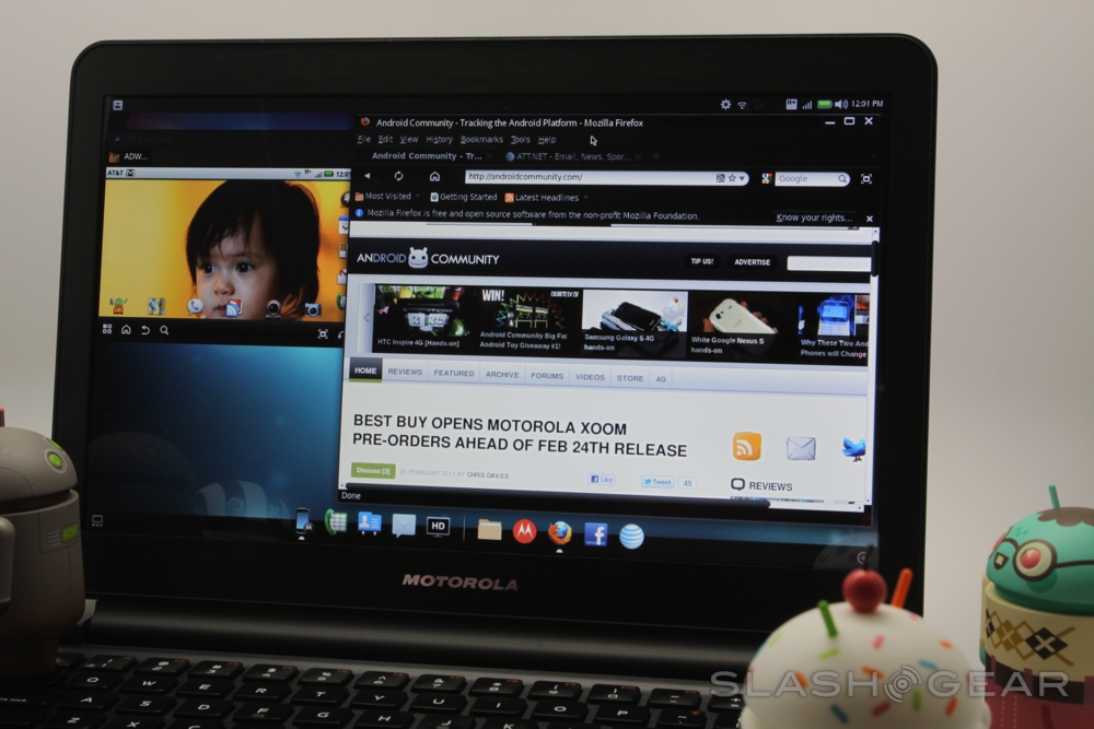 You can boot into the Entertainment Center – more of which in the HD Dock section – or, more likely, the browser (there are shortcuts for AT&T, Facebook and Motorola, but they simply open the relevant pages in Firefox), and both the phone view and browser view can be maximized to full-screen (though the phone image is merely magnified, not upscaled, so gets relatively pixelated in the process).