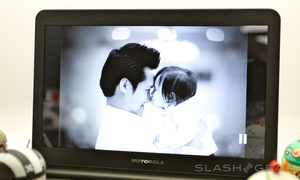 The qHD display is obviously great for showing off photos and video, but since the ATRIX 4G packs an HDMI output it's also easy to hook up a nearby HDTV for direct playback. Plugged in – with the bundled mini HDMI to HDMI cable – the smartphone boots into a dedicated Entertainment Center interface, with a big-screen friendly UI for photos, video and audio playback. The ATRIX 4G itself shows a remote control for navigating, and the phone supports AAC, H.264, MP3, MPEG-4, WMA9, eAAC+, AMR NB and AAC+ formats with video playback at up to 30fps. With the 1080p update this will be even more useful, but 720p looked good nonetheless.