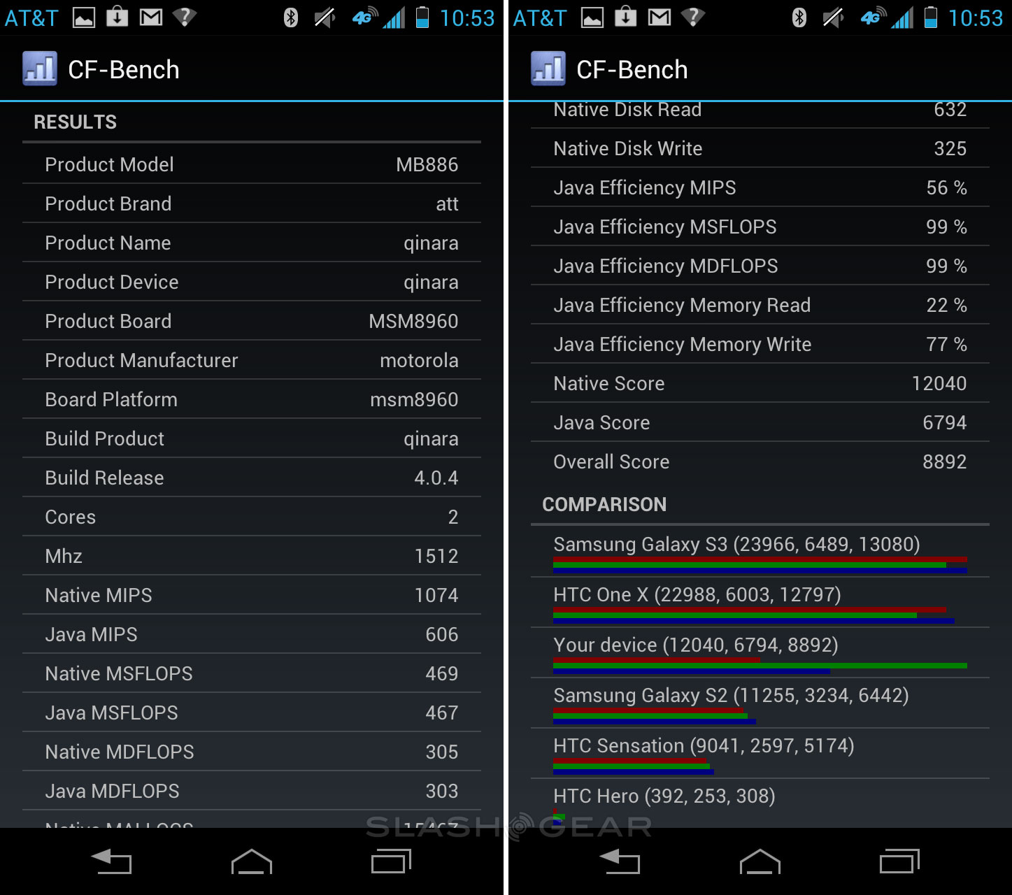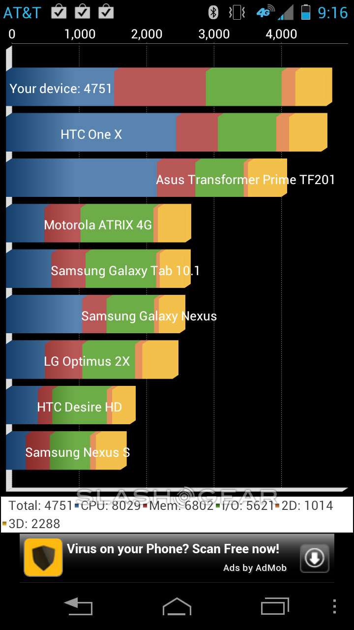 And of course, don't forget to check out the benchmarks. This device has a surprising set of results, considering it's able to beat out the HTC One X in overall score in Quadrant, then loses out in a big way to the top guns in the other two tests. Have a peek here, and remember – it's all synthetic!