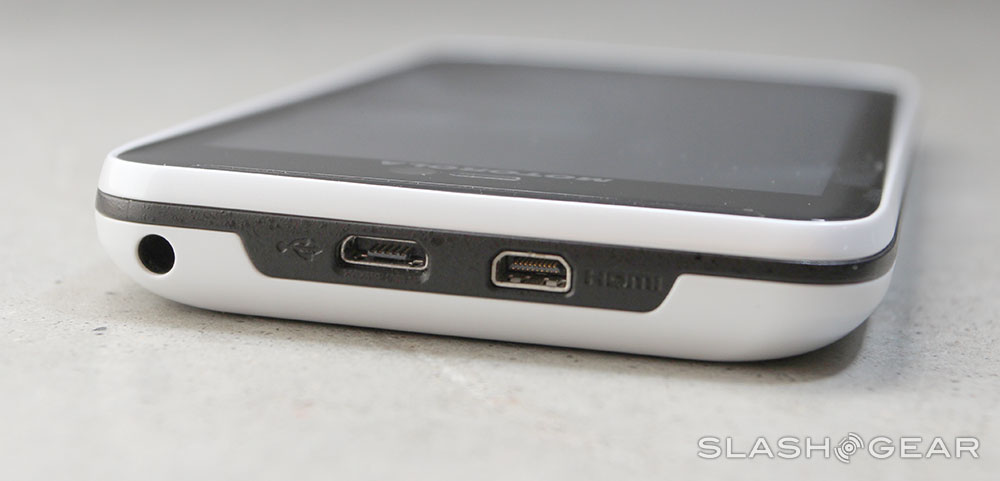 Up on the side you've got a door that opens to microSD and microSIM card slots where you'll put your AT&T 4G LTE card, you'll find two silver metal buttons up on the right side for power and volume, and up top you've got Motorola's microUSB/microHDMI port combo ready for use with a collection of Motorola-made accessories. These accessories are essentially the same as we saw back when we reviewed the RAZR, as you can see over on Android Community in-depth, and you can use this device with the most recent Motorola Lapdocks as well.