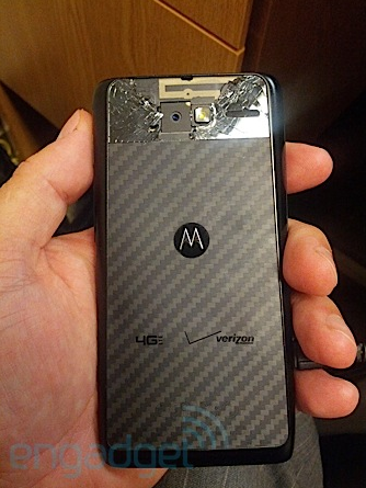The back panel above the kevlar coating appears to have been smashed in this particular model, leading us to believe that it may have been an older version of the device or not quite reinforced as well as the final model. We've not encountered any other recent Motorola device with such a smash – it's quite unlike them to create a fragile piece like what we're seeing here.