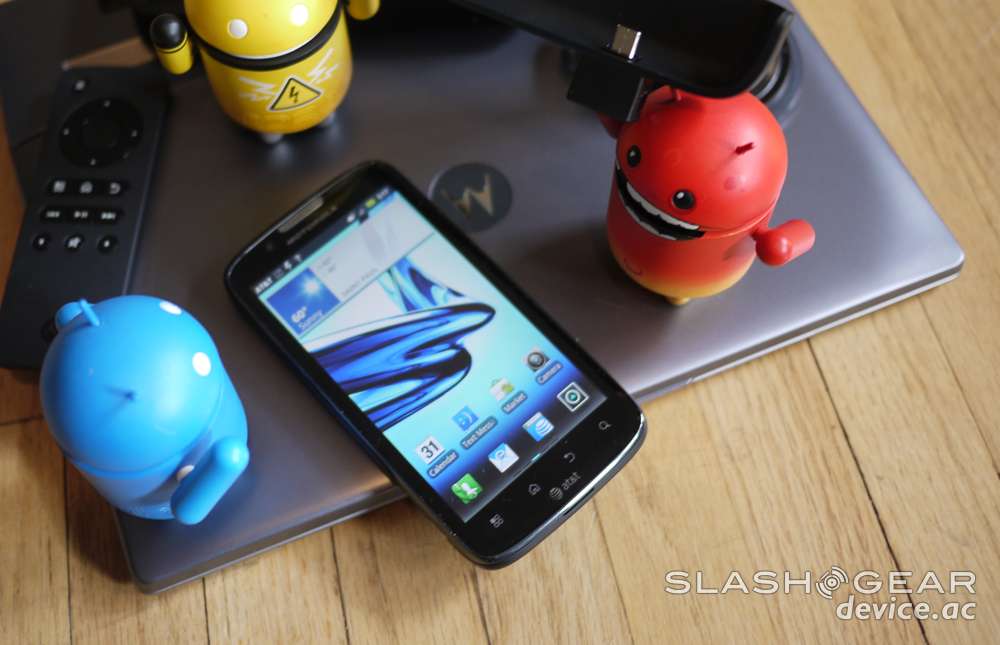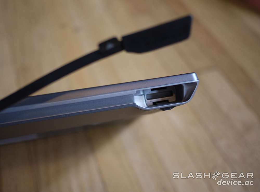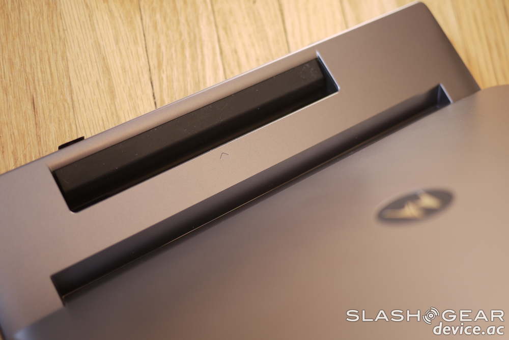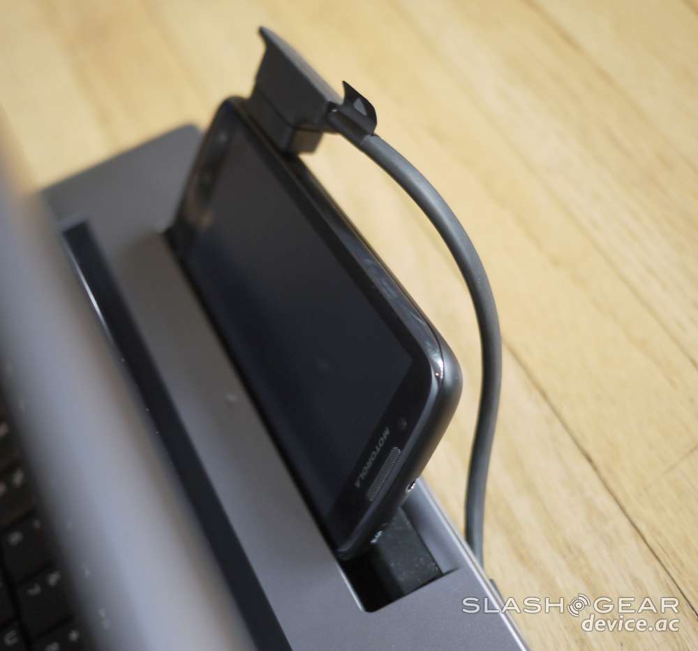 Though I've got a couple of compatible Motorola devices to test with the Lapdock, unless otherwise noted I'll be working with the ATRIX 2, a device that either also is or will be soon posted on SlashGear in a full review as well. One of the most instantly apparent differences between this Lapdock and the one that came out earlier this year with the original ATRIX is the amount of devices that are compatible. This new round of Webtop Laptops has a cord that plugs into the microHDMI/microUSB port combo that the newest round of Motorola smartphones have, and contrary to what we saw at the DROID RAZR release, the device doesn't then just have to sit on the table. Instead, as you can see, there's a rubbery-material-coated opening behind the display, right above the cord, that allows you to pocket whichever smartphone you've got plugged in.