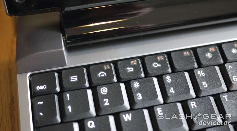 The keyboard has your regular full QWERTY set of keys plus volume keys, light and dark buttons for the display, play, next, back, and the Android home row of buttons that you've been seeing on your smartphones since the beginning: Home, Search, Menu, and Back. The keyboard itself has no space between any of the keys, making for a compact situation when typing. Because I'm used to a full-sized keyboard with a significant amount of space between each key, typing on this Lapdock doesn't feel as natural as it should – but it's not impossible.