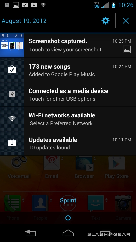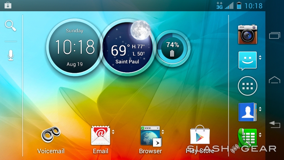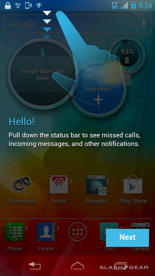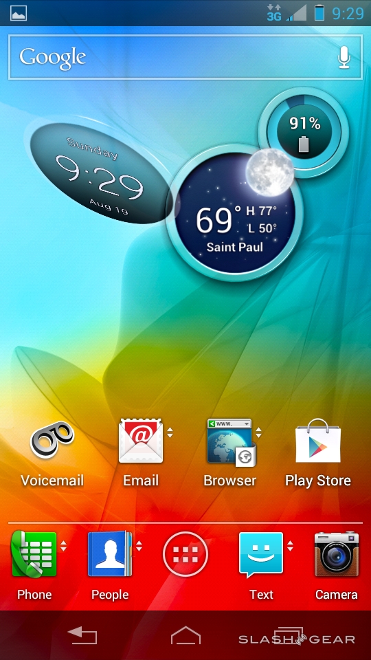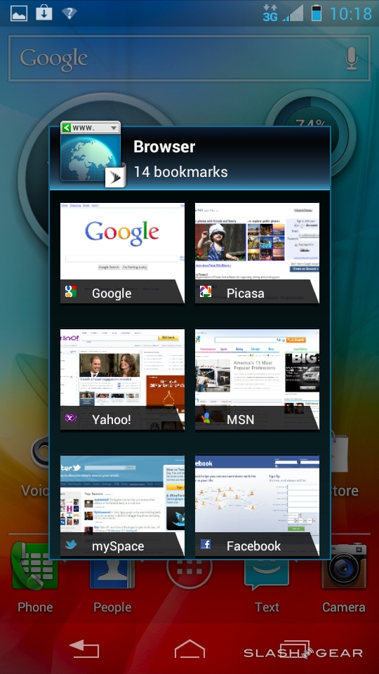 Motorola is also bringing an extremely unique set of abilities to Android. If you've got your standard web browser on your home screen, for example, you can place your finger on it and swipe upward to attain a pop-up window with bookmarks. This same ability works in different ways with several built-in apps on this device.