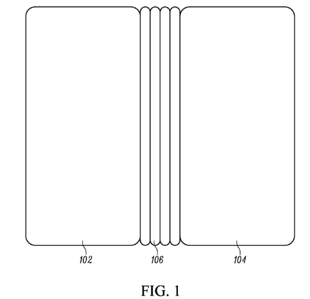 The patent includes the description of the most unique feature, the foldable display, here called the "flexible display." "The flexible display is inwardly folding and deforms when the first device housing of the electronic device pivots toward the second electronic device housing about the hinge from an open position toward or to a closed position."