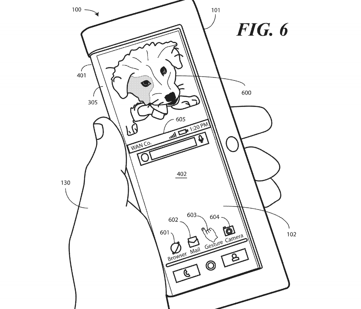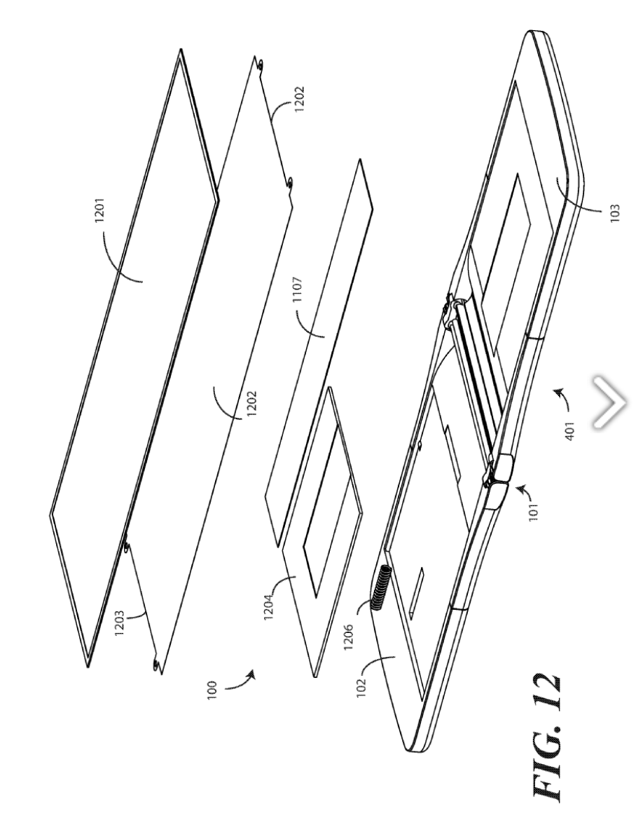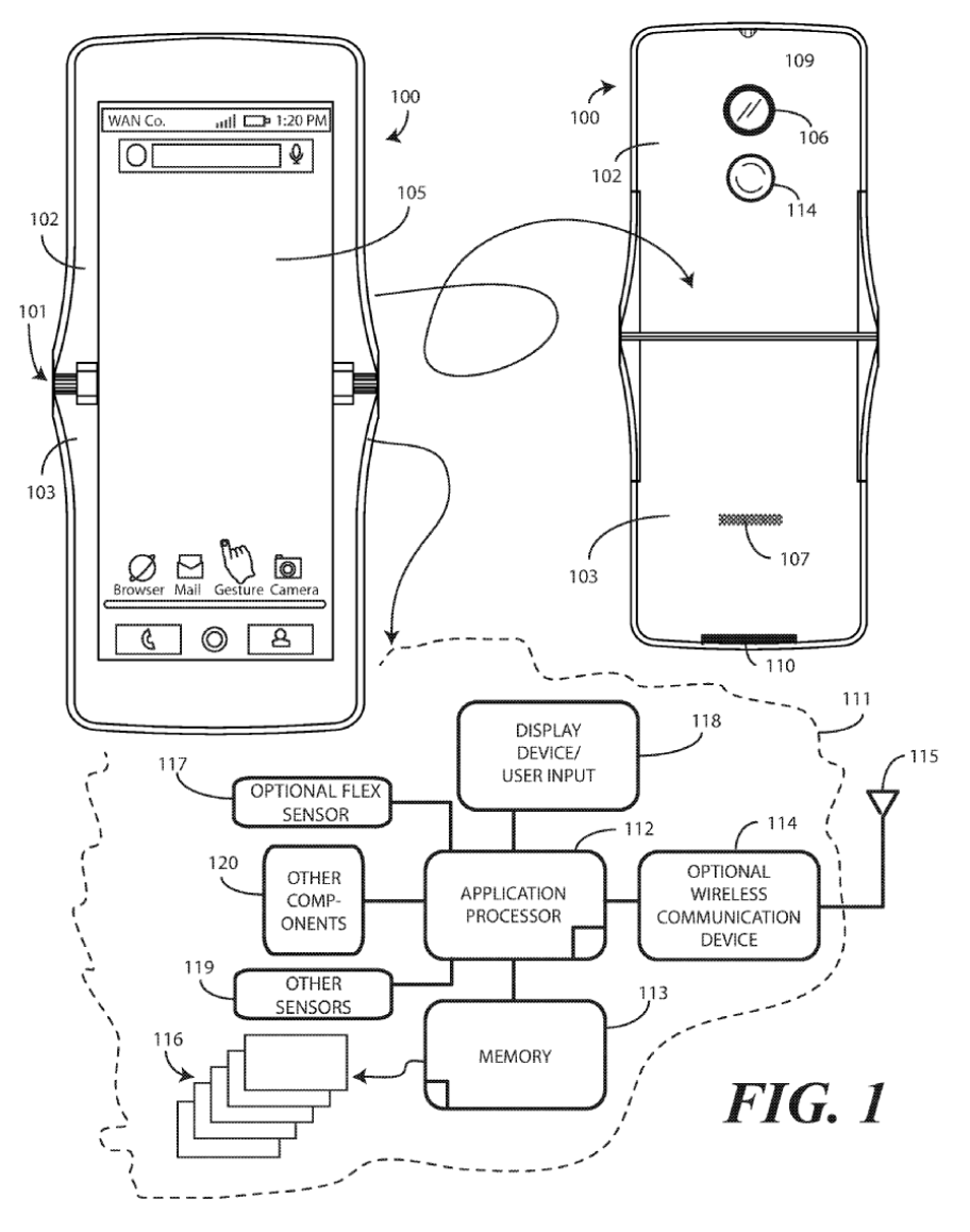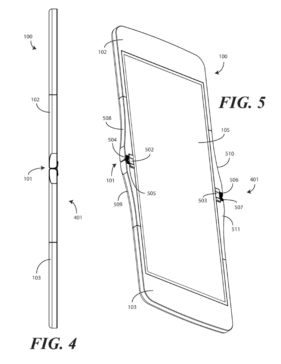This patent centers on one design, but leads in to a very similar set of patents, all with foldable display components. "Other displays can be configured to accommodate both bends and folds. In one or more embodiments the display 105 may be formed from multiple layers of flexible material such as flexible sheets of polymer or other materials."