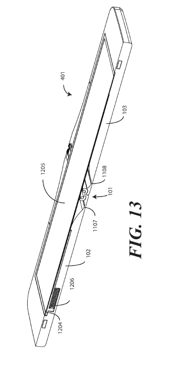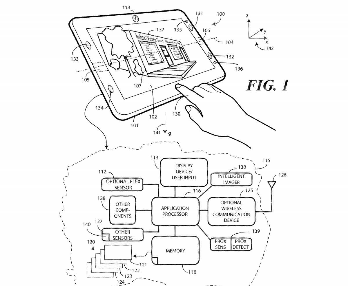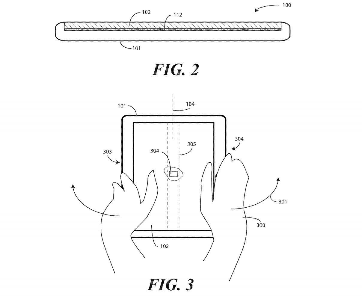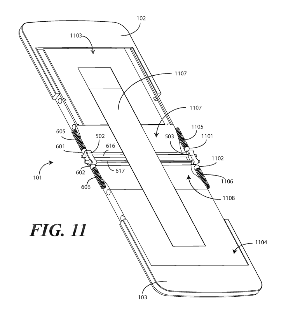 This patent centers on one design, but leads in to a very similar set of patents, all with foldable display components. "Other displays can be configured to accommodate both bends and folds. In one or more embodiments the display 105 may be formed from multiple layers of flexible material such as flexible sheets of polymer or other materials."