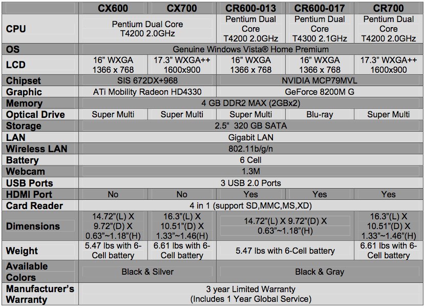 Both CR600 models and the CR700 feature the NVIDIA GeForce 8200M GPU and an additional HDMI port for outstanding display capabilities and an enhanced visual experience. The CR600-017 offers users with more advanced viewing needs a superior CPU (Intel Pentium Dual Core T4300 2.1GHz) and a Blu-ray DVD player.