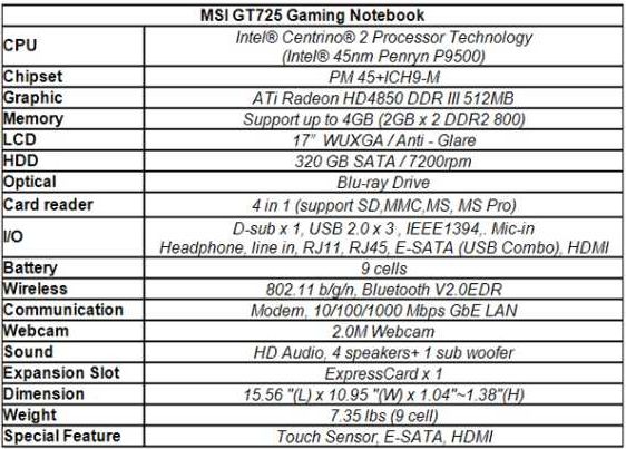 MSI Announces GT725 – World's First Gaming Notebook to Feature ATi Radeon HD4850 and Deliver Desktop Gaming Performance with a Single GPUGT725 features 17" 1080P HD LCD Monitor, Blu-ray Player and 9-Cell Battery