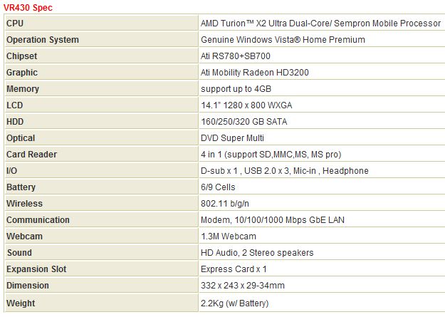 Other specs include gigabit ethernet, WiFi b/g/n and a 1.3-megapixel webcam, together with an ExpressCard slot, three USB 2.0 ports and a VGA output. Two batteries are on offer, a 6-cell or a 9-cell pack, with the VR430's weight starting at 2.2kg. It measures 332 x 243 x 29-34 mm.