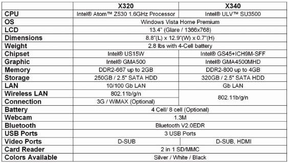 The X320 and X340 have a 1366 x 768 13.4-inch display, with the former having GMA500 graphics and the latter 1080p-capable GMA4500MHD graphics; it also has an HDMI output. Storage is 250GB on the X320 and 320GB on the X340 while RAM is up to 2GB and 4GB respectively. WiFi on both machines is b/g/n; they also have Bluetooth 2.0+EDR, three USB 2.0 ports and VGA outputs.