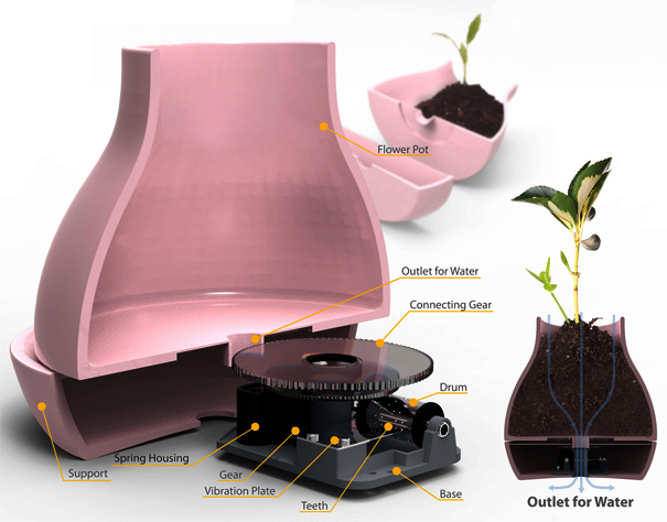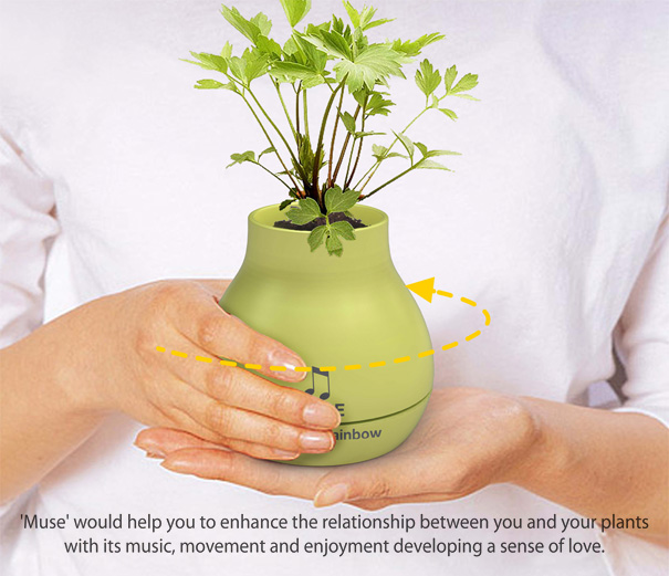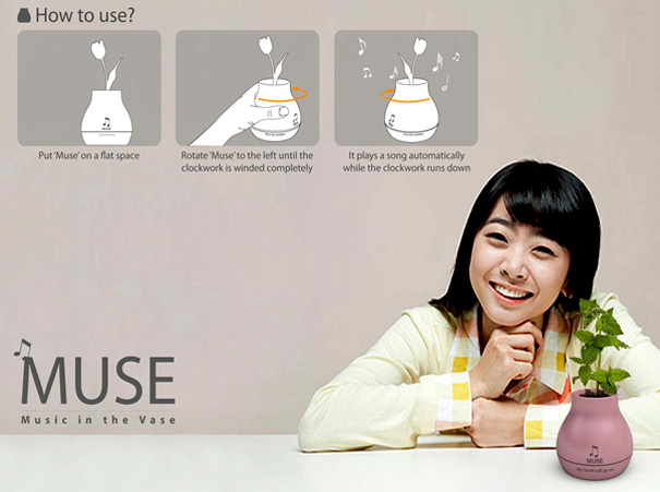 The musical vase is designed to hold your plant inside of it, so it works not only as a musical device, but also something to hold your favorite plant. It's designed by Lie Zhong-Fa, Jeon Se-Yong, and Koo Yoori, and it plays music after you twist it. Inside the vase you'll find plenty of room to put dirt, or whatever it is you may use to help your plant grow, as well as a water outlet. You just put the Muse on a flat surface, twist it to the left until it won't twist anymore, and then sit back and listen to the music play out until the clockwork winds down.