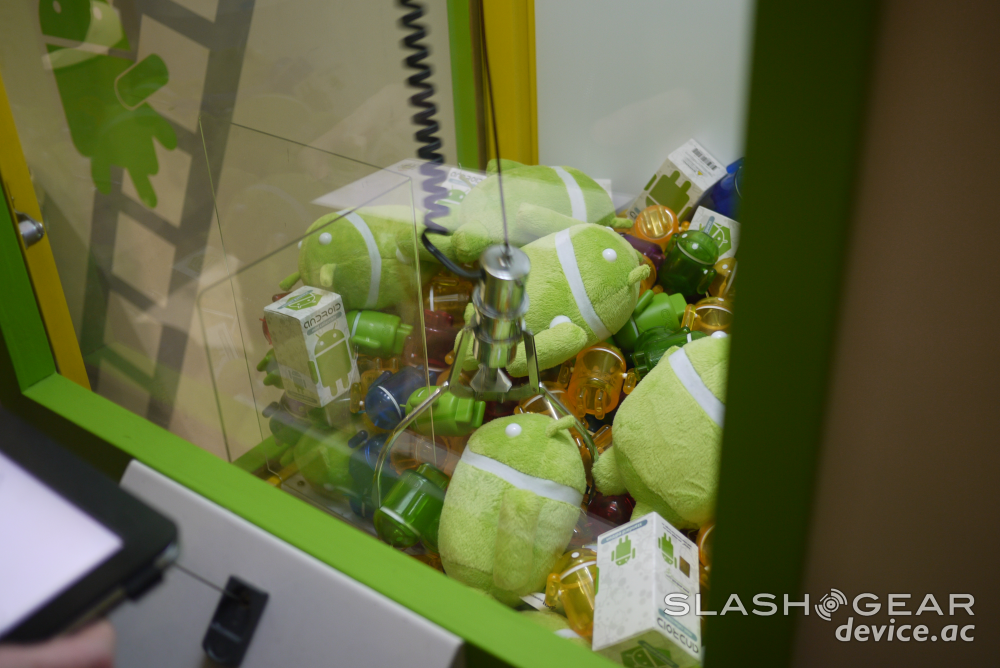 This tour will start at the front desk where you'd be lucky to find an Android pin without being extra excellent at timing and charm. Next there's the gigantic television screen playing loops of the Galaxy Nexus floating through space, this above a cove of sorts designed by Mr Brainwash brand graffiti, this area promoting Google Music almost exclusively. Also in this room was one of two Android claw machines which anyone could win a plush Android or Android plastic toy from – these plastic toys, by the way, were part of the series just released in recent weeks by Andrew Bell and crew over at Dead Zebra, much like last year when they pre-released Series 2 via Google at MWC again.