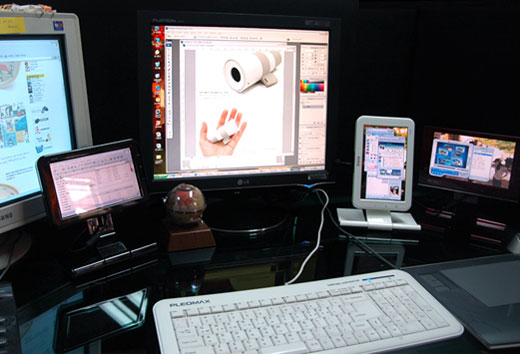 The base model, UM-710, is merely a 7-inch LCD sub-display, ideal for dragging across toolbars and media players. The UM-750, meanwhile, adds a touchscreen layer, webcam and integrated DMB TV tuner.