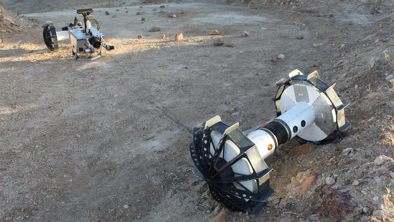 NASA has tested DuAxel in the Mojave Desert with a small team of engineers from the NASA Jet Propulsion Laboratory. The tests were designed to check the rover's versatility, and the team says DuAxel performed very well. The rover was able to operate entirely autonomously, deploying its instruments without needing a robotic arm.