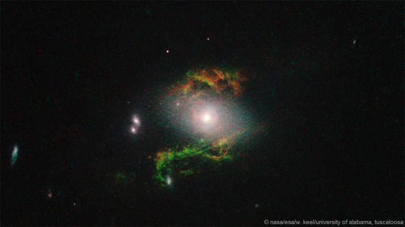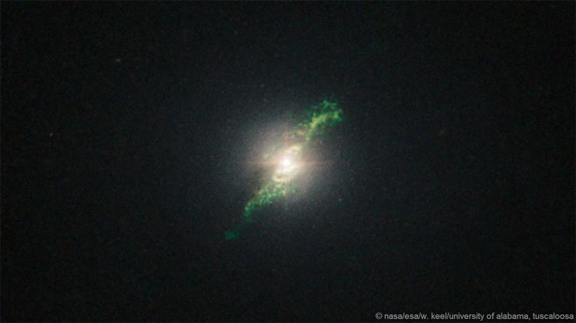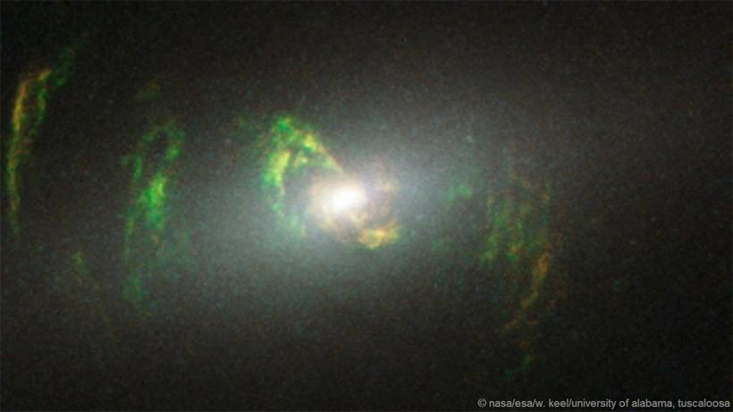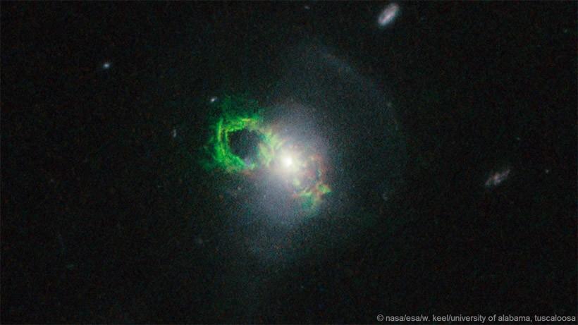 The black hole would have slurped up the material around it, superheated it, and expelled energy back into space. That radiation streaming out of the black hole illuminated the green shapes that the Hubble Space Telescope snapped images of floating in space.