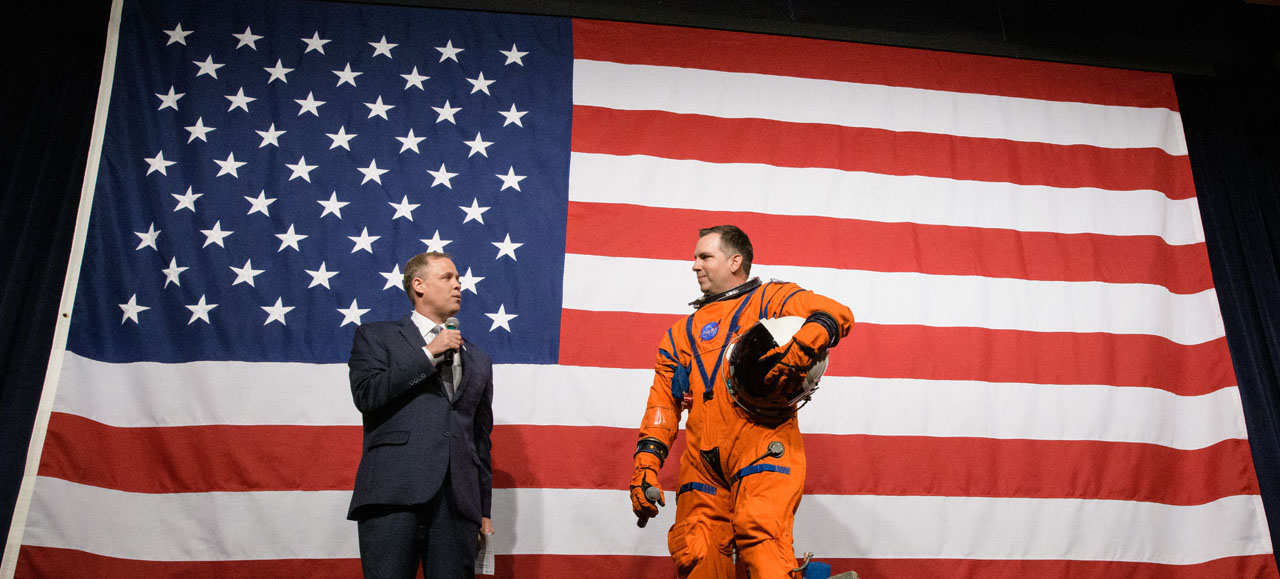 The orange spacesuit is called the Orion Crew Survival System suit and is worn by Dustin Gohmert, Orion Crew Survival Systems Project manager at the Johnson Space Center. The two new spacesuits are Artemis generation spacesuits. Artemis is the name for the mission to land the first woman and the next man on the Moon by 2024.
