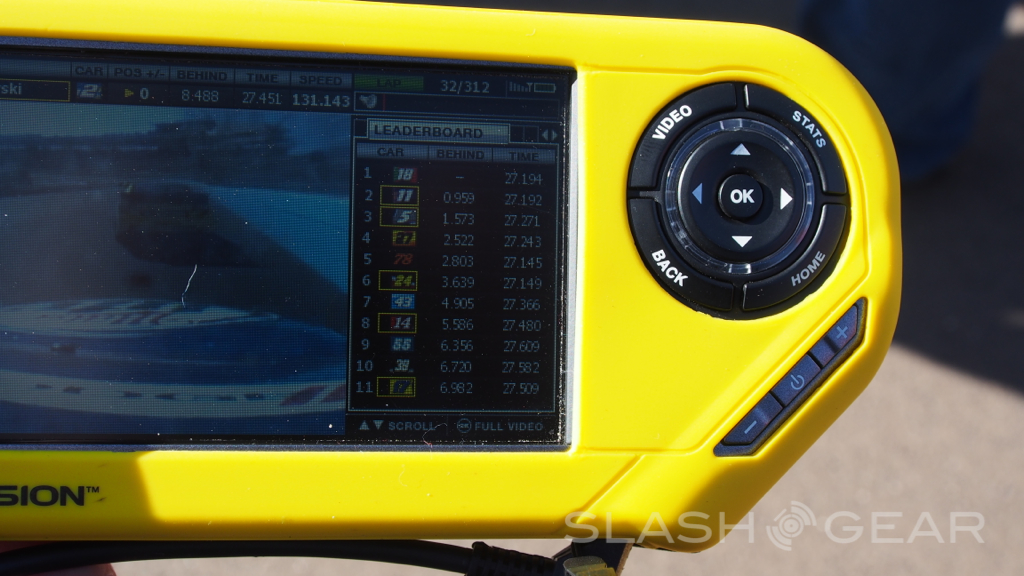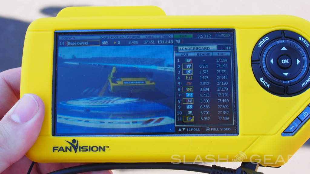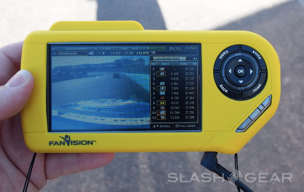 Pretty neat right? Oh and did we mention instant replay? After seeing that crazy (and vindictive) crash by Jeff Gordon Sunday, we were able to get live instant replay within a matter of seconds thanks to the FanVision. It was quite awesome watching a live view from the hood of his damaged race car as he slid into the rest of the drivers late in the race. The FanVision employs a 4-inch display, it's wrapped in rubber and is quite durable, and can even handle the elements on race day. The controls on the side let you pan between fullscreen and stat view, select the driver of your choice, control instant replay and anything else you'd like. Panning through the in-car cameras was a breeze, and as you saw on video there's no lag whatsoever. This was live, up to the second, and brings racing fans closer to the action than ever before.