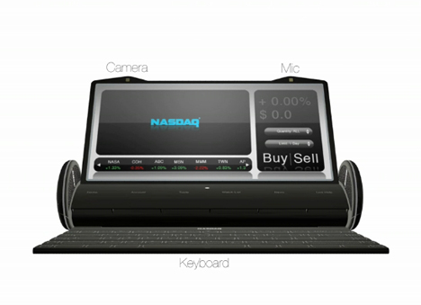 Given how well (yes, sarcasm) many fund managers have been doing in handling investment portfolios lately, plenty of people are thinking it might be a better idea to decide their own stock-market dalliances. And since any new venture demands a slick, shiny new piece of hardware to go with it, here's Allen Liu's NasdaqQ3 Home Trading Terminal concept, designed especially to cater to those trading from their kitchen table.